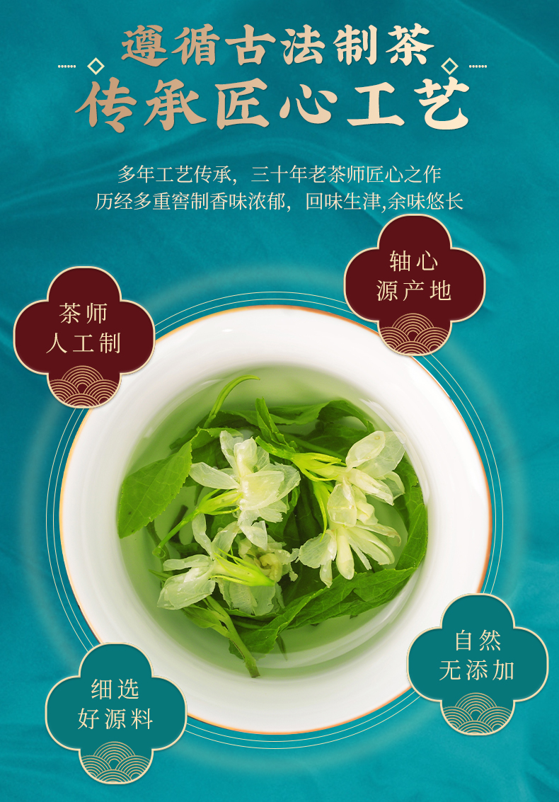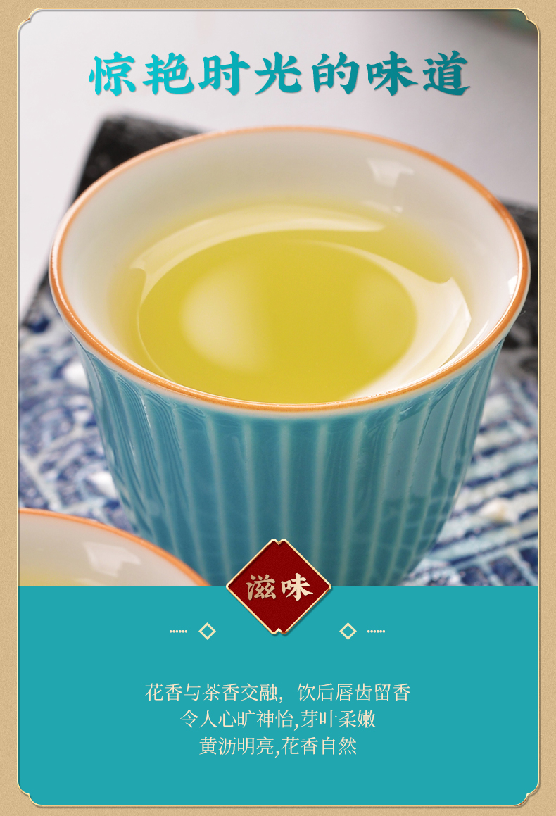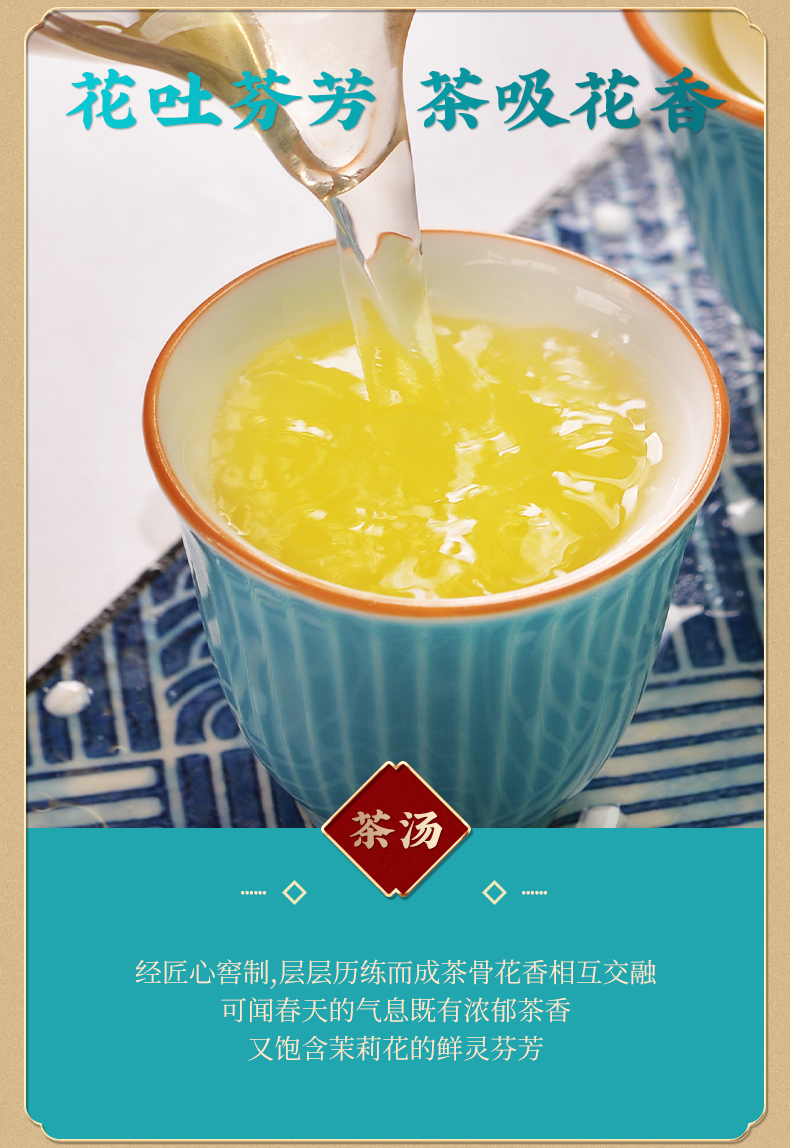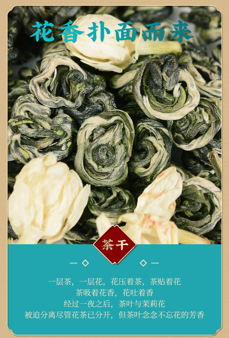 这款茉莉“玉螺”采用高山绿茶嫩芽配上伏天茉莉,三十年老茶师匠心制作,古法八窖一提制作工艺,让绿茶鲜叶充分的吸收茉莉的浓郁花香,入口花香十足,回味甘甜生津,余味悠长。