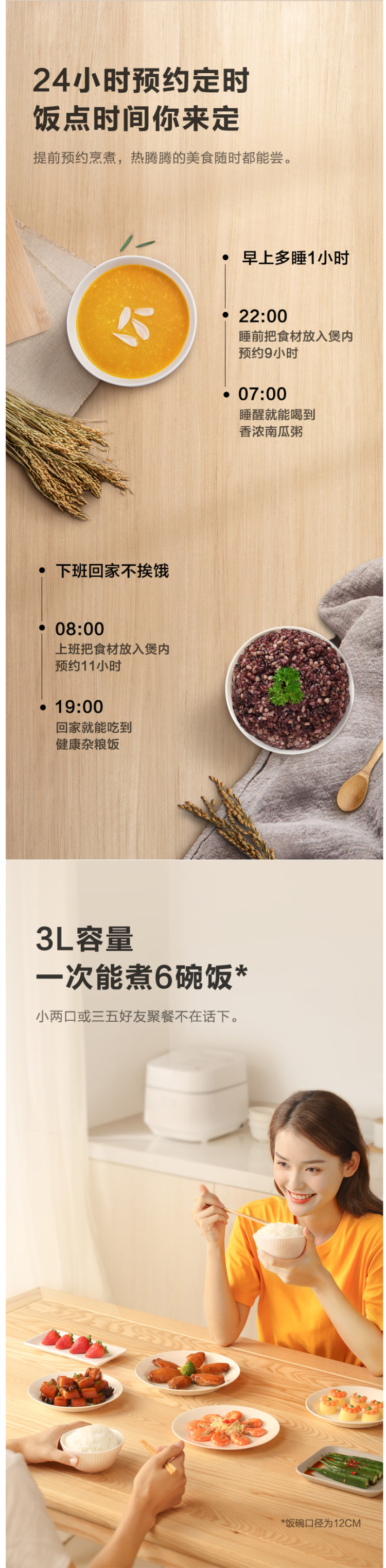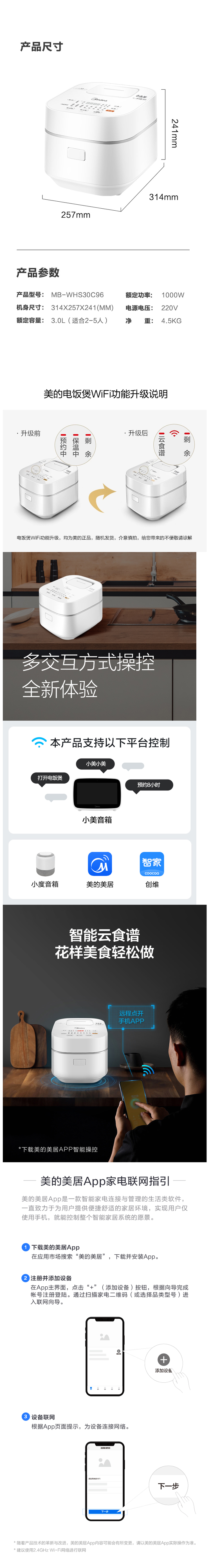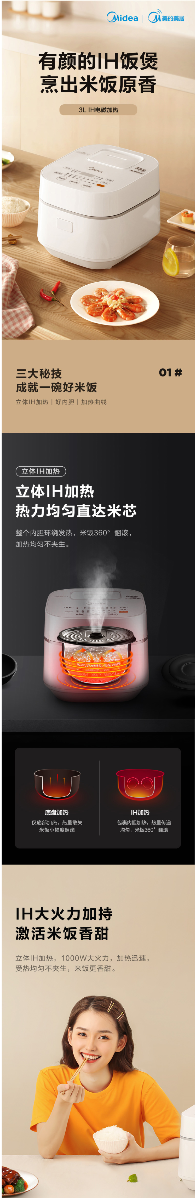 这款美的 MB-WHS30C96 智能IH电饭煲,集电饭煲+汤锅+蒸锅与一体,功能丰富;关键是颜值超高,简约设计+纯白机身+流畅的线条,非常赞;容量是3L,比一般的电饭煲小1L,但是也够一家三口人使用。