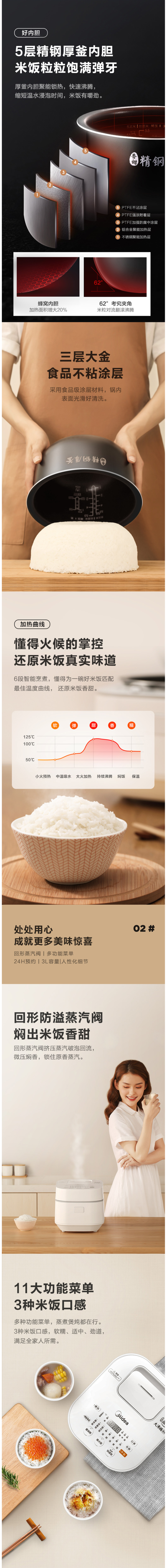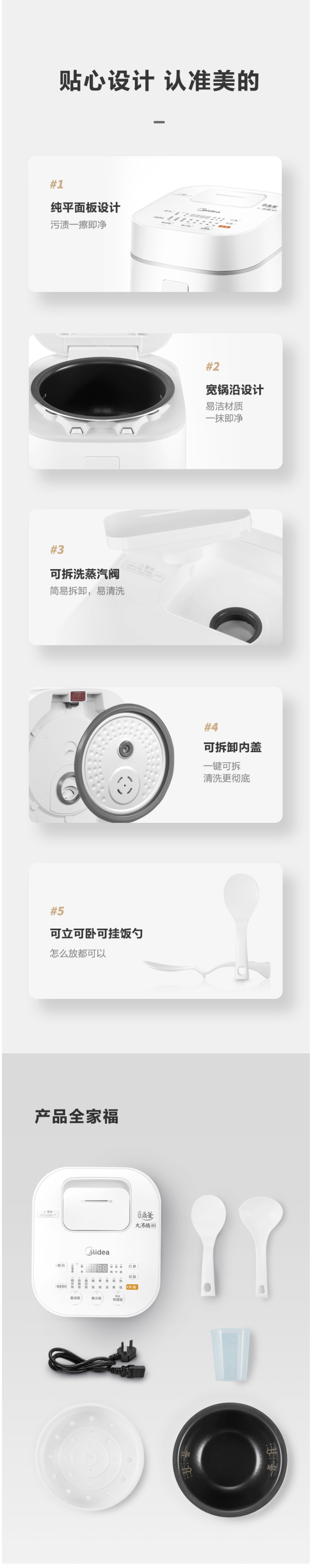 可一键操作香浓粥、柴火饭和快速饭,使用非常方便;还可以选择米饭的口感,软糯、劲道,适中,满足你的不同需求;纯平触摸面板,不沾油渍不褪色,污渍一抹即净,结实耐用,增添质感;按下红色按钮,可轻松拆卸内盖,拆下后不掉落,方便清洗;配可立饭勺,更卫生。