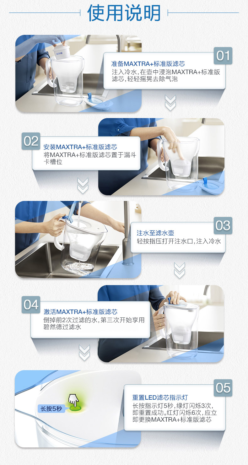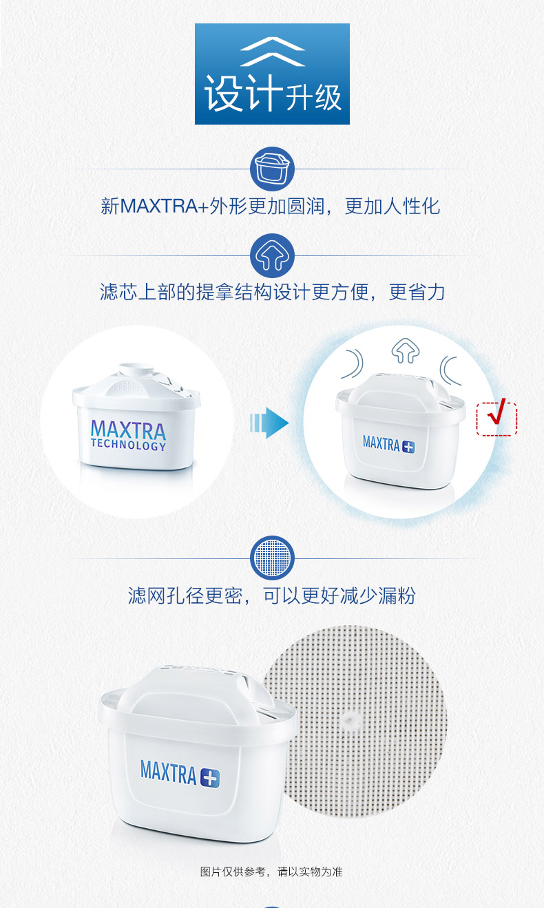 滤芯方面,德国原装进口的Maxtra+,比传统的一代滤芯在过滤能力方面增加了20%,还改良了MicroFlow Technology 微流控技术,使水的味道比以往更好。滤芯中所含的活性炭,能有效过滤水中的重金属、水碱、杀虫剂、有机杂质、氯气和异味。