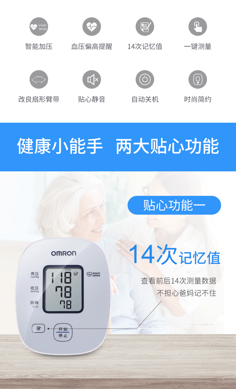 内置特有intellisense核心生物传感技术,根据被测量者的血压情况自动调节加压力度,实现缩短测量时间,搭配改良过的扇形臂带,提高测量舒适度,确保结果更加准确,最多记录14次记录数据,具备高血压自动警示功能。测量结束后,若不继续操作,系统约2分钟后自动关机。