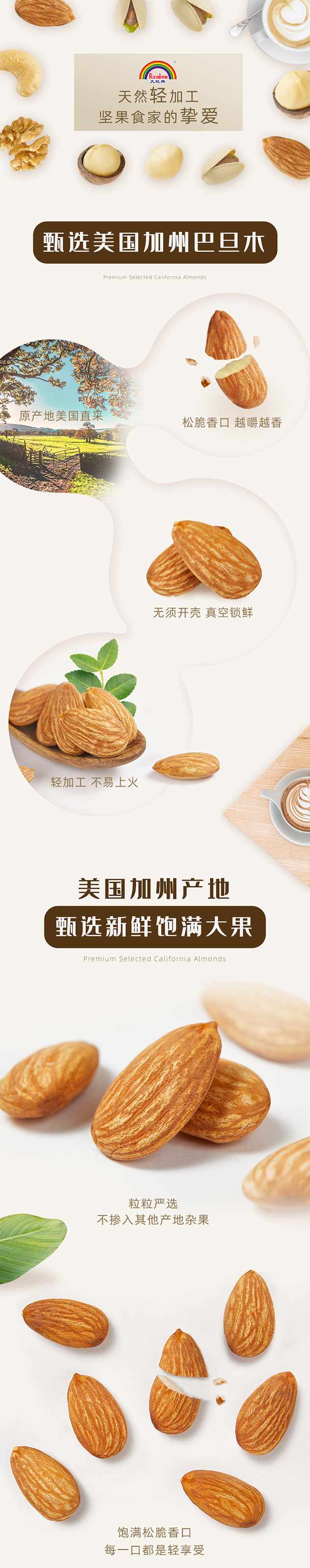 60年老品牌天虹,美国加州原产巴旦木果仁,也叫美国大杏仁,恒温烘焙,保留原香,果粒饱满,口感酥脆,含丰富的蛋白质,膳食纤维,维生素E,胡萝卜素。