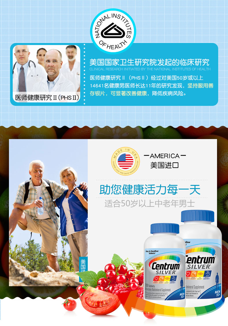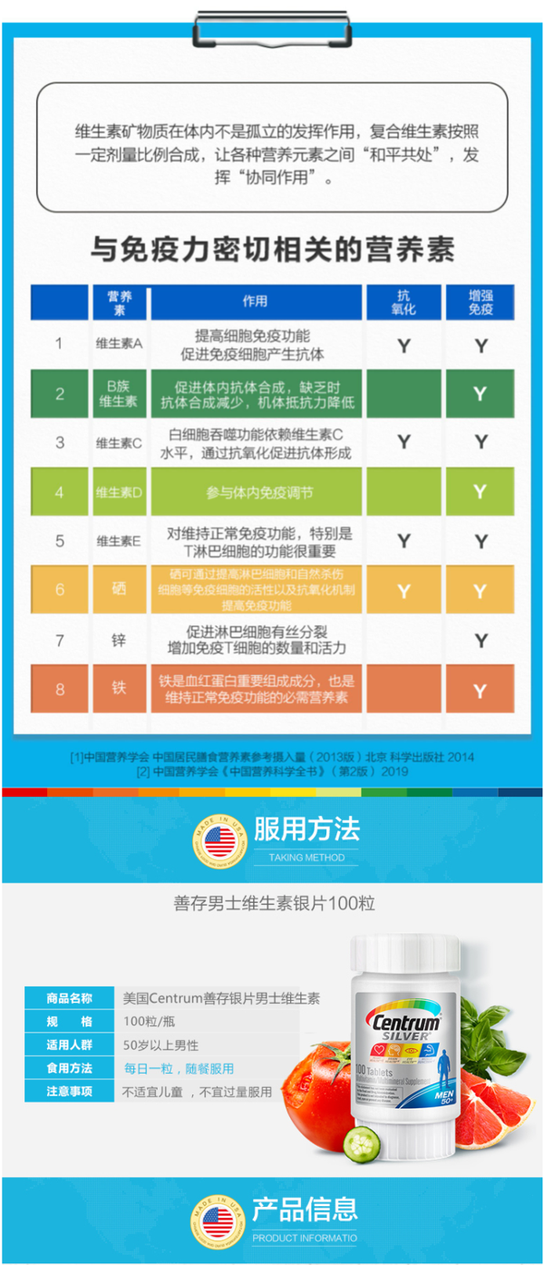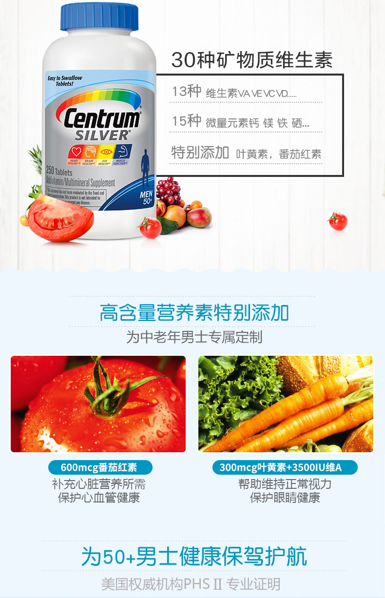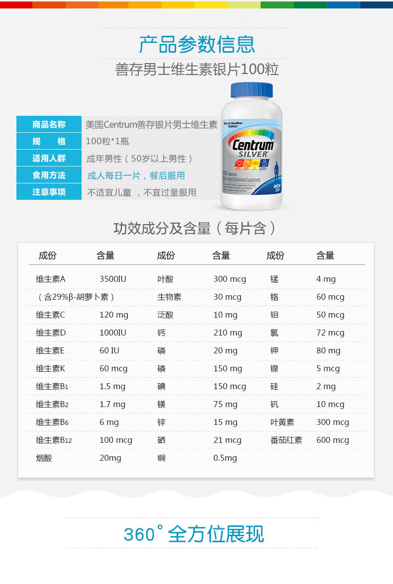 这款善存银片,专为中老年男士设计,复合30种营养,13种维生素、15种矿物质维生素,特别添加了叶黄素,番茄红素科学配比,可补充日常所需营养,提高免疫力规格:200粒,每日1粒随餐服用。