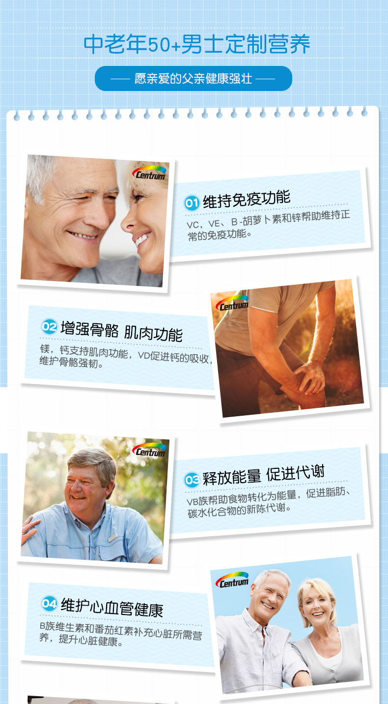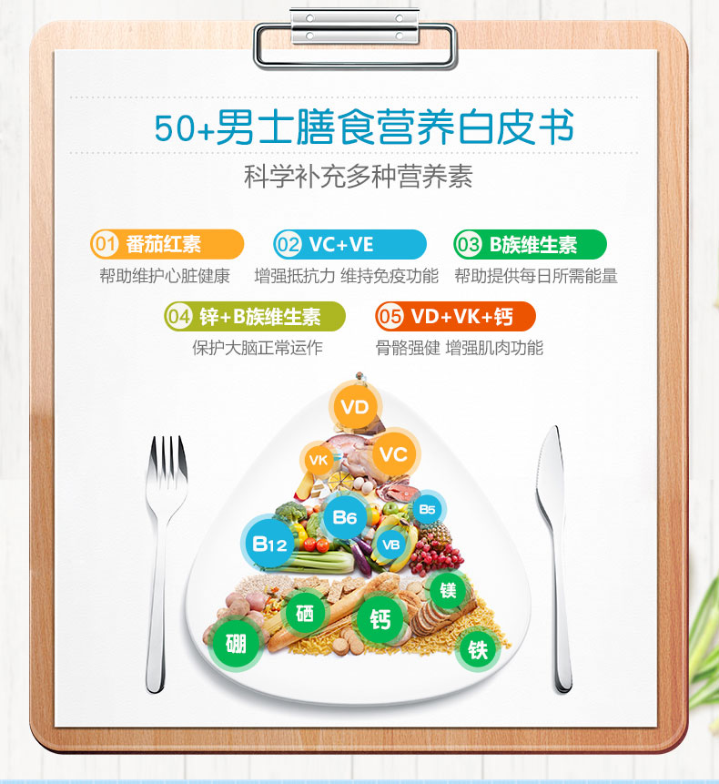 功效:维护心脑血管健康,增强骨骼肌肉能力、促进代谢,提高免疫力,其中番茄红素可以补充心脏所需营养,保护心血管健康,叶黄素+维生素A 可帮助维持正常视力保护眼睛健康,适合经常吸烟酗酒、骨质酥松、视力逐渐减退,食欲不振免疫力低下中老年男士。