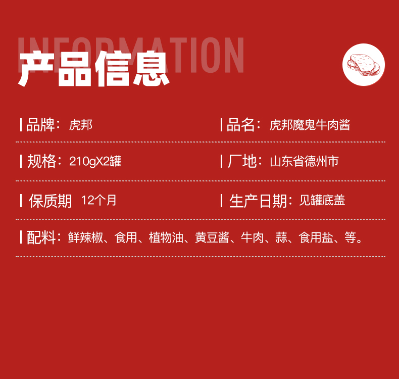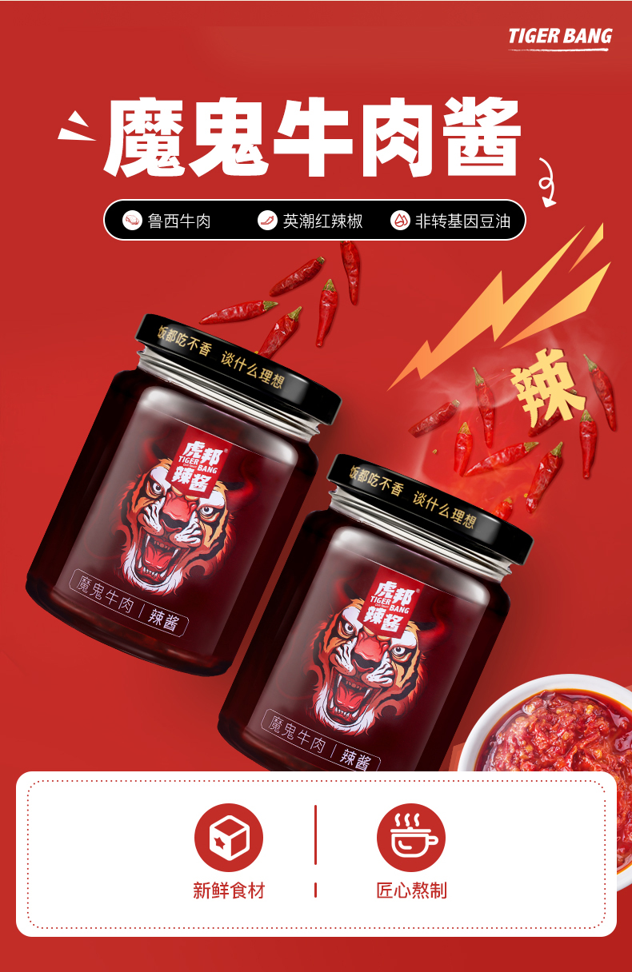 天猫虎邦食品旗舰店,15-17日 天猫吃货节,¥33.9元 吃货价,=33.9元到手价,魔鬼辣椒牛肉酱此价;牛肉加倍、辣度爆表。此外还有彩椒酱、香菇酱可选略有差价。