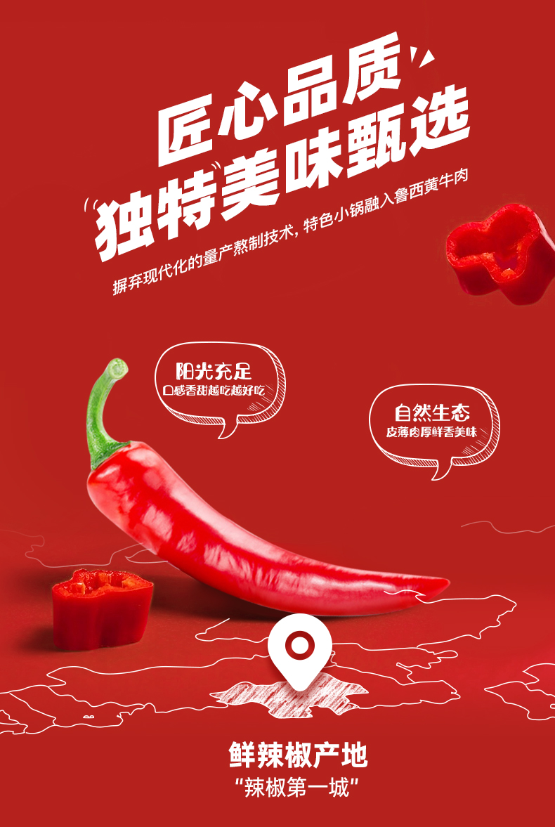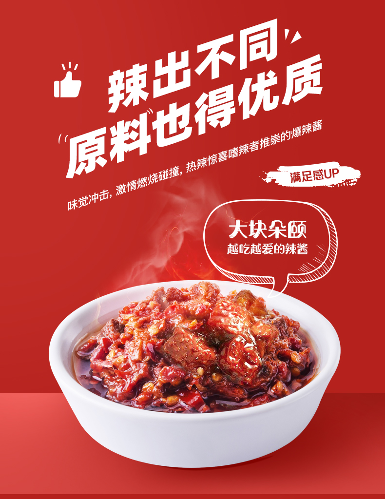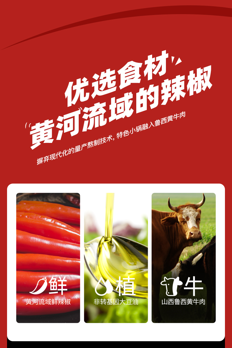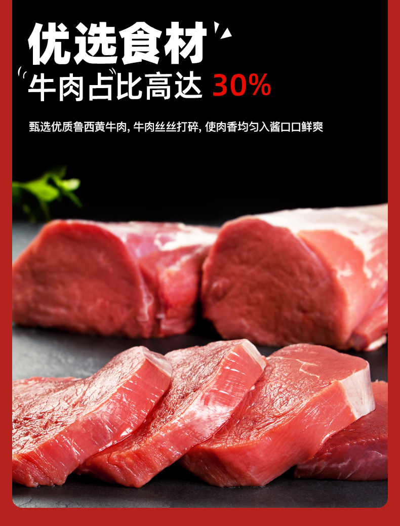 原料甄选英潮红辣椒,山西鲁西黄牛肉,牛肉占比高达30%,牛肉丝丝打碎,使肉香均匀融入酱中,口感鲜爽、辣味强烈,拌面、拌饭、蘸料用餐百搭,让您的味蕾得到充分满足。