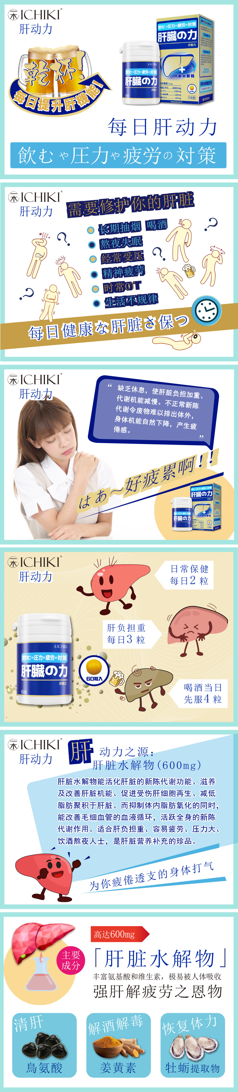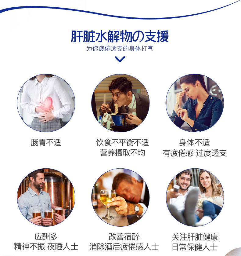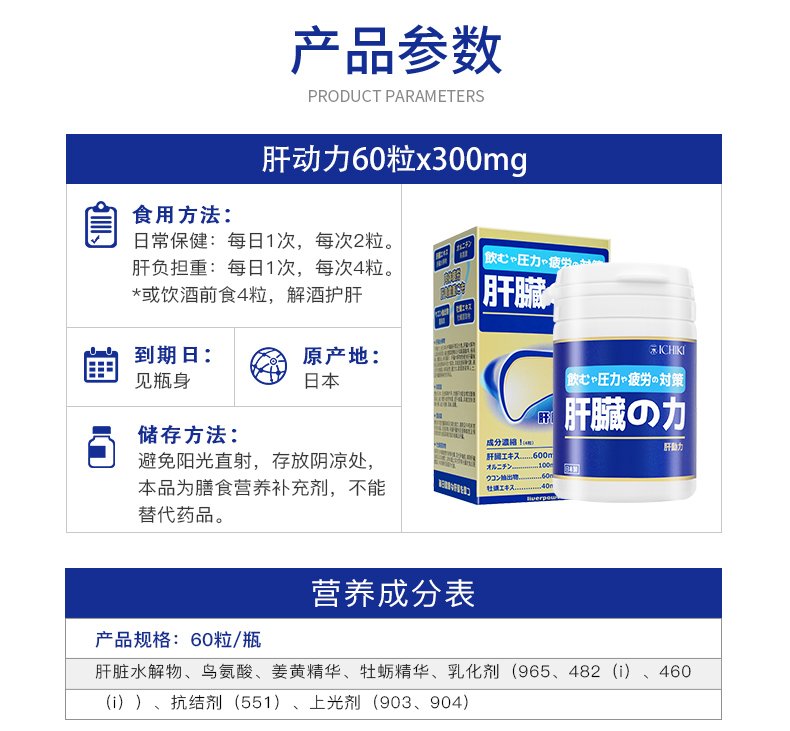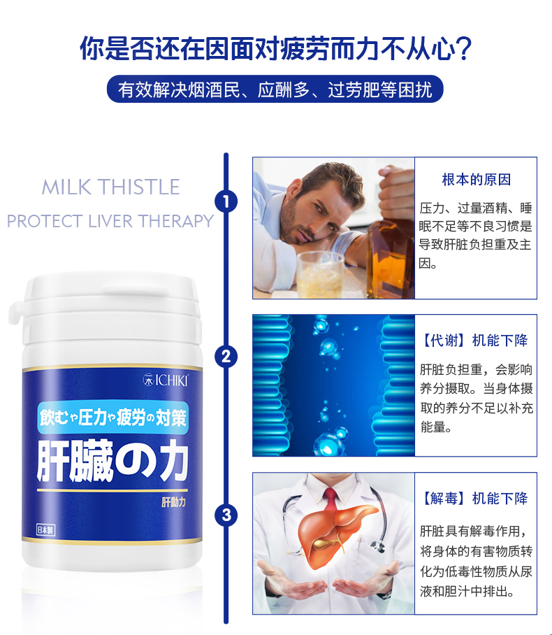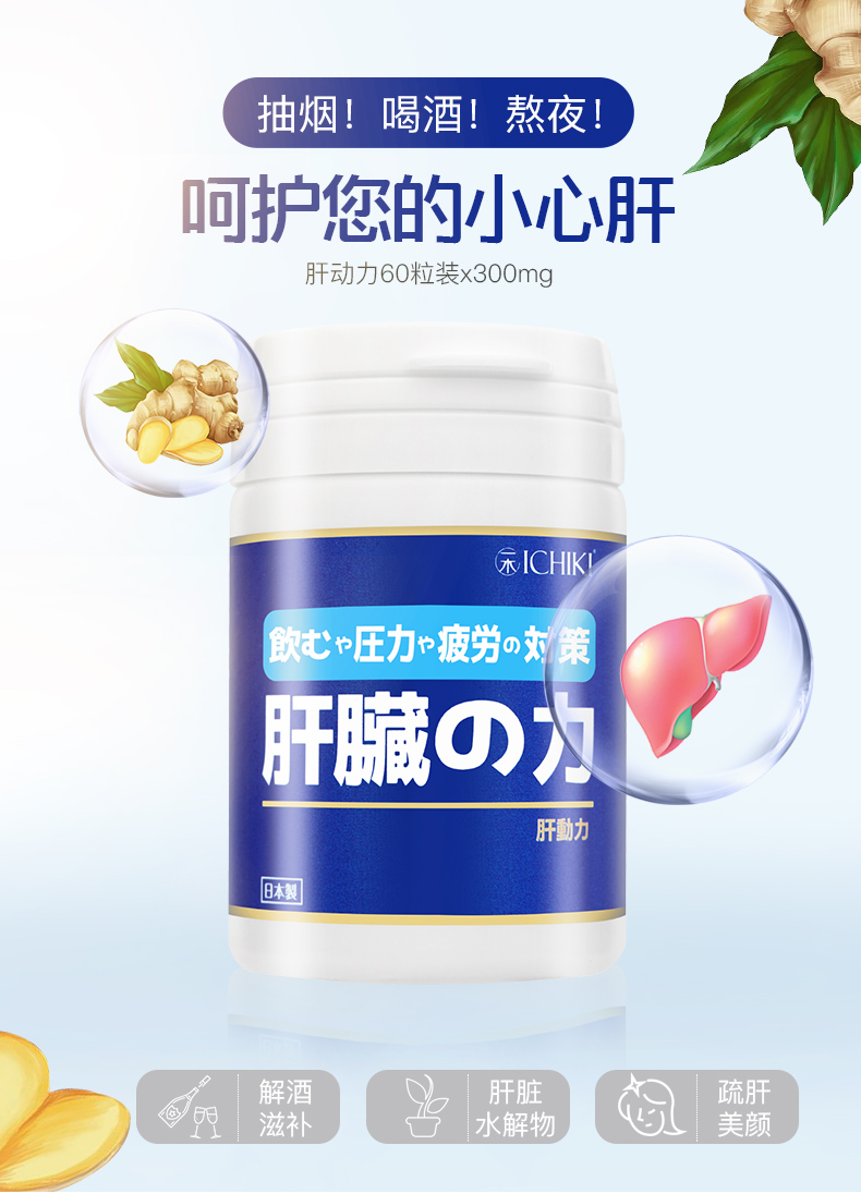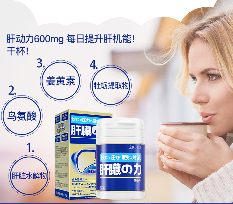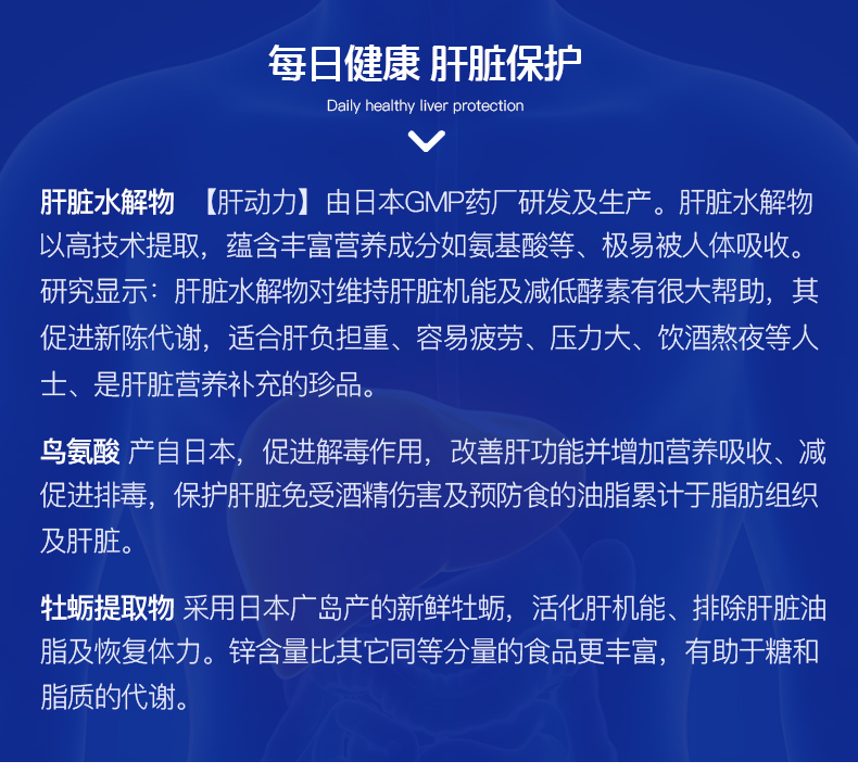 含有肝脏水解物,鸟氨酸、姜黄、牡蛎提取物4种有效成分,促进新陈代谢,减轻肝脏负担,活化肝机能,增加营养吸收,促进排毒,保护肝脏免受酒精伤害,预防油脂累积与脂肪组织及肝脏。适合烟民、应酬多、过劳肥胖等困扰人群。