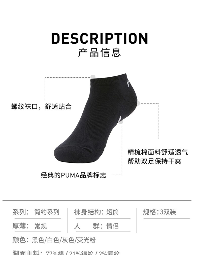 彪马(Puma)男女中筒棉袜,规格3双装,采用77%精梳棉,21%锦纶和2%氨纶材质的纱线制成,精梳棉相对于一般的棉纱,更加的柔软光滑,面料表面平整,没有棉结,舒适亲肤,弹性好,透气性佳,袜口不紧绷,35-46码均有选择。