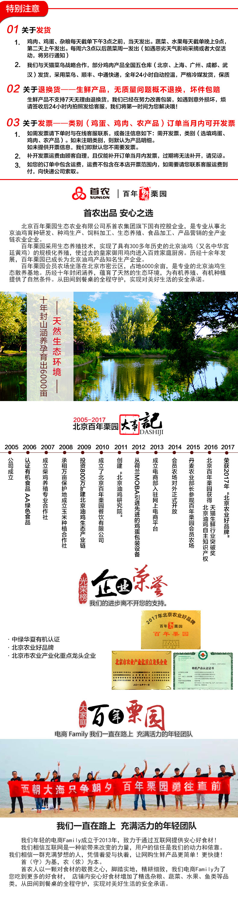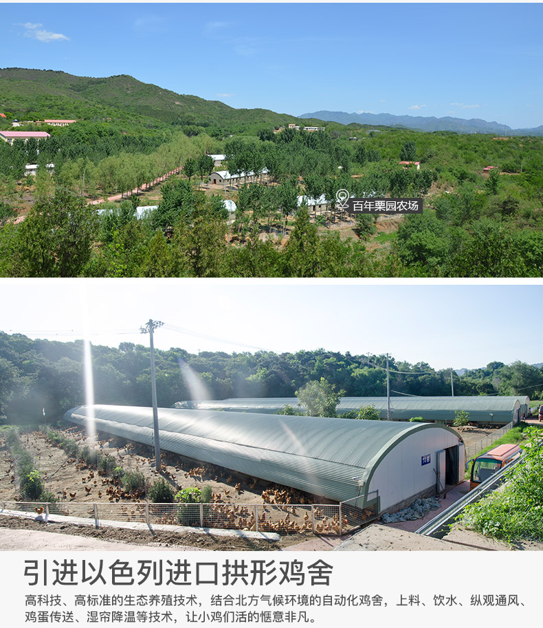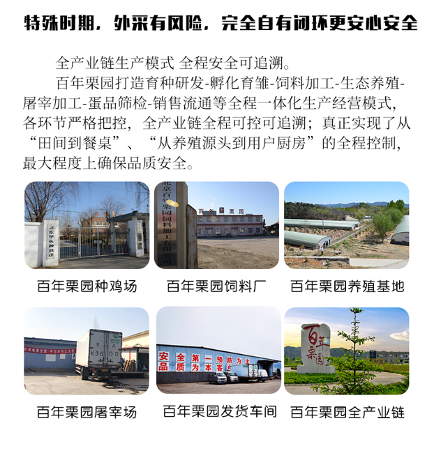百年栗园是首农集团旗下的国有控股企业,专注于北京油鸡的全产业链企业,农场坐落于北京密云区,占地6000余亩,是专业的北京油鸡散养基地,生产的产品时有机认证的AA绿色产品。一体化生产经营,全产业链全程可追溯,品质靠谱。