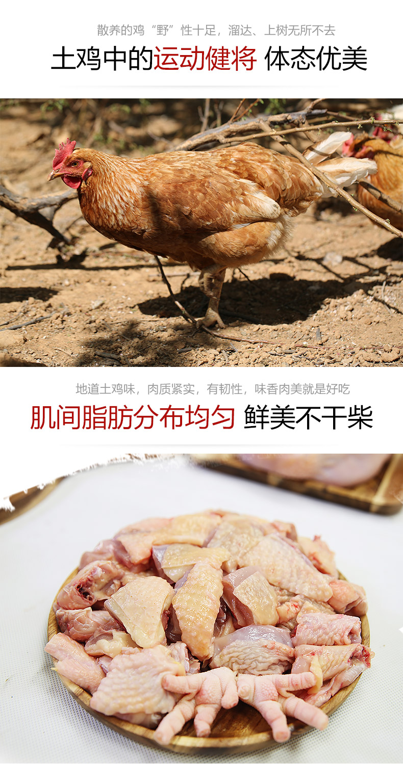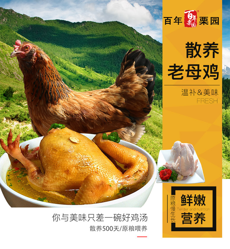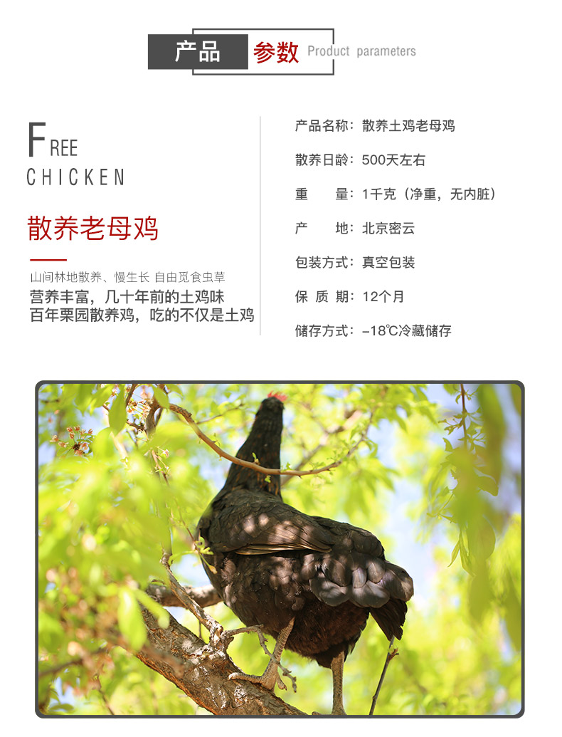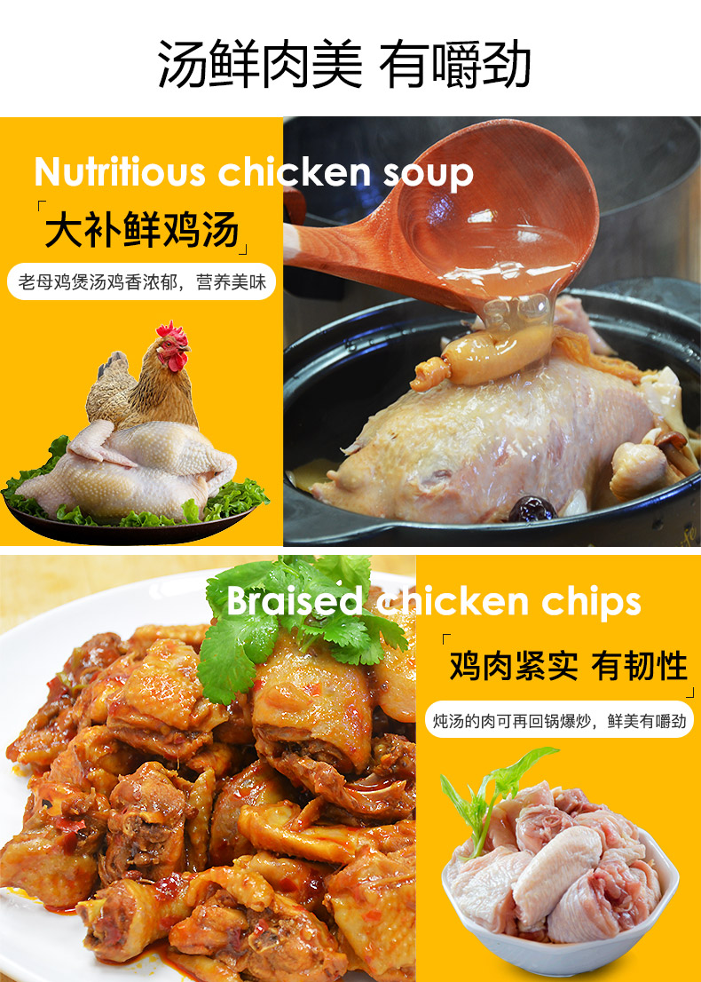 这款散养500天老母鸡,由于生长期长,鸡肉中所含的鲜味物质要比仔鸡多,这是使鸡汤味道更鲜美的主要原因。另外,老母鸡中脂肪含量比较高,炖出的汤也更香一些。肉质紧实不柴,滋味鲜美,适合煲汤,并富有营养,有滋补养身的作用。