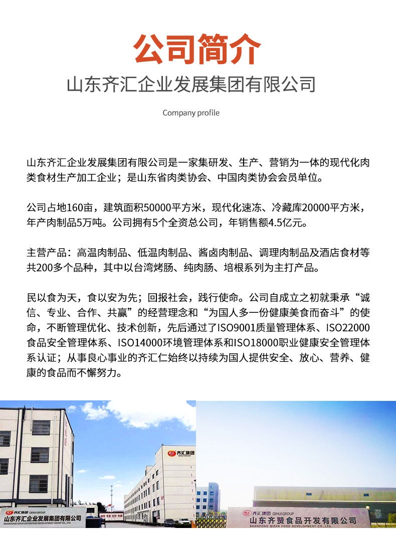 山东齐汇食品有限公司是家集研发、生产、营销为体的现代化肉类食材生产加工企业,是山东省肉类协会、中国肉类协会会员单位,2017年中国火腿肠十大品牌。