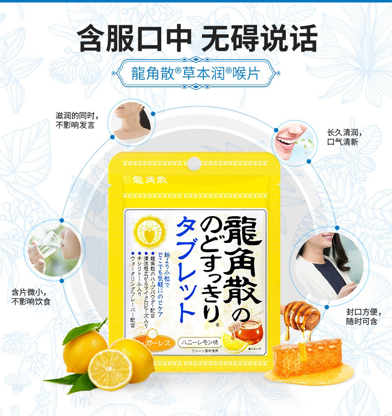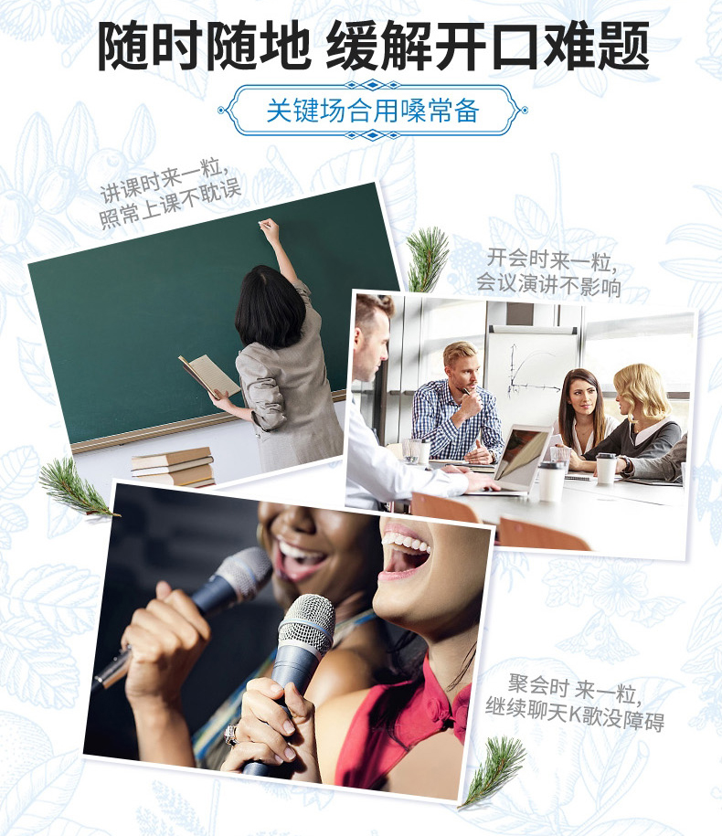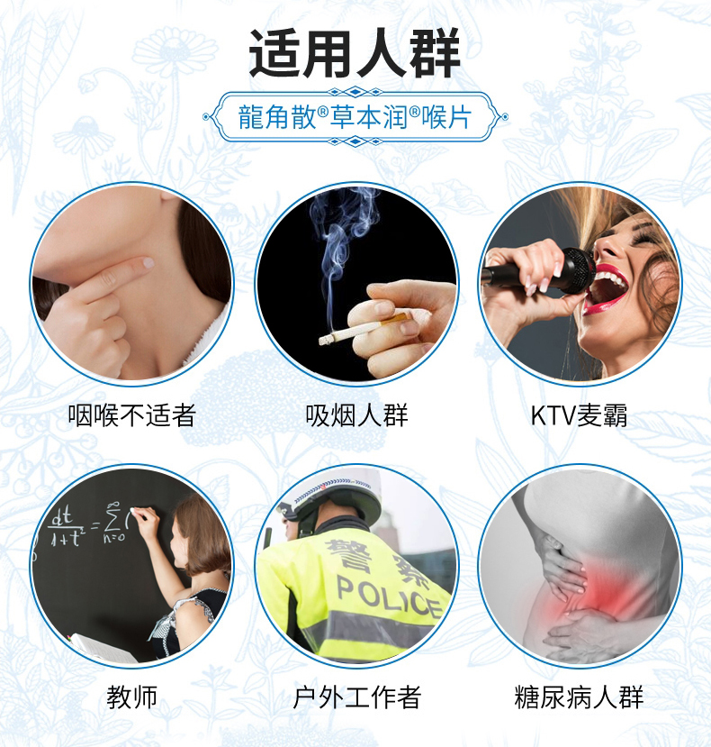 对于感冒引起的喉咙肿痛及吸烟过多导致的嗓子不适,都有显著缓和作用,适用于咽喉不适者、吸烟人群、感冒儿童、教师、户外工作者、KTV麦霸等。