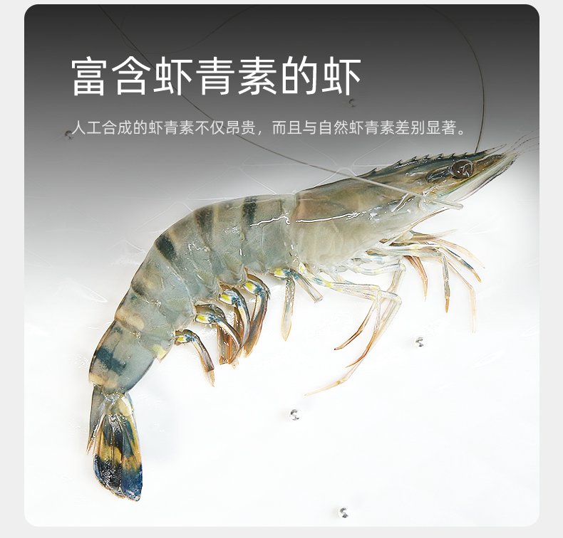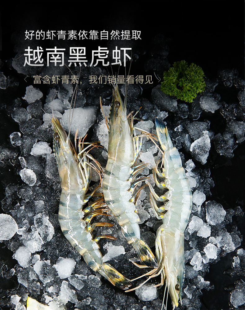 黑虎虾是一种高档虾类,是海虾中的“高富帅”。黑虎虾所含虾青素含量超其他虾种20%,虾青素是一种最强的抗氧化剂,它本身能显著增强虾的存活率和产卵率,以及抵抗外界恶劣环境的能力。同样,人和动物食用高含虾青素的虾肉也有益健康,口感上虾肉相比其他虾种更加Q弹。