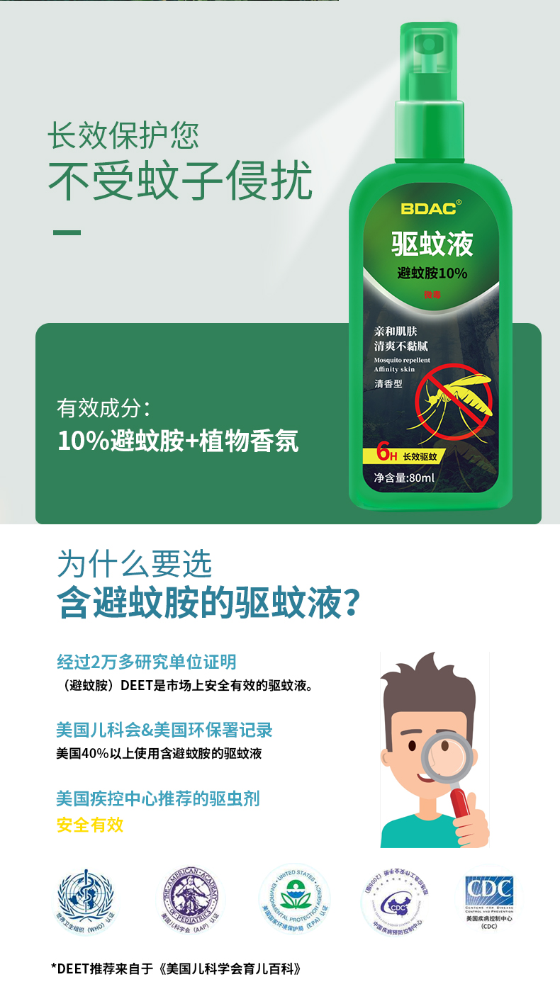 DEET又称“避蚊胺”,用于驱蚊已经有将近60年的历史,是研究和应用最广的驱蚊成分,至今在安全性和有效性方面仍是其他产品的"参考标准"。美国儿科医师协会认为2个月以上的宝宝就可以使用DEET含量在30%以下的产品。