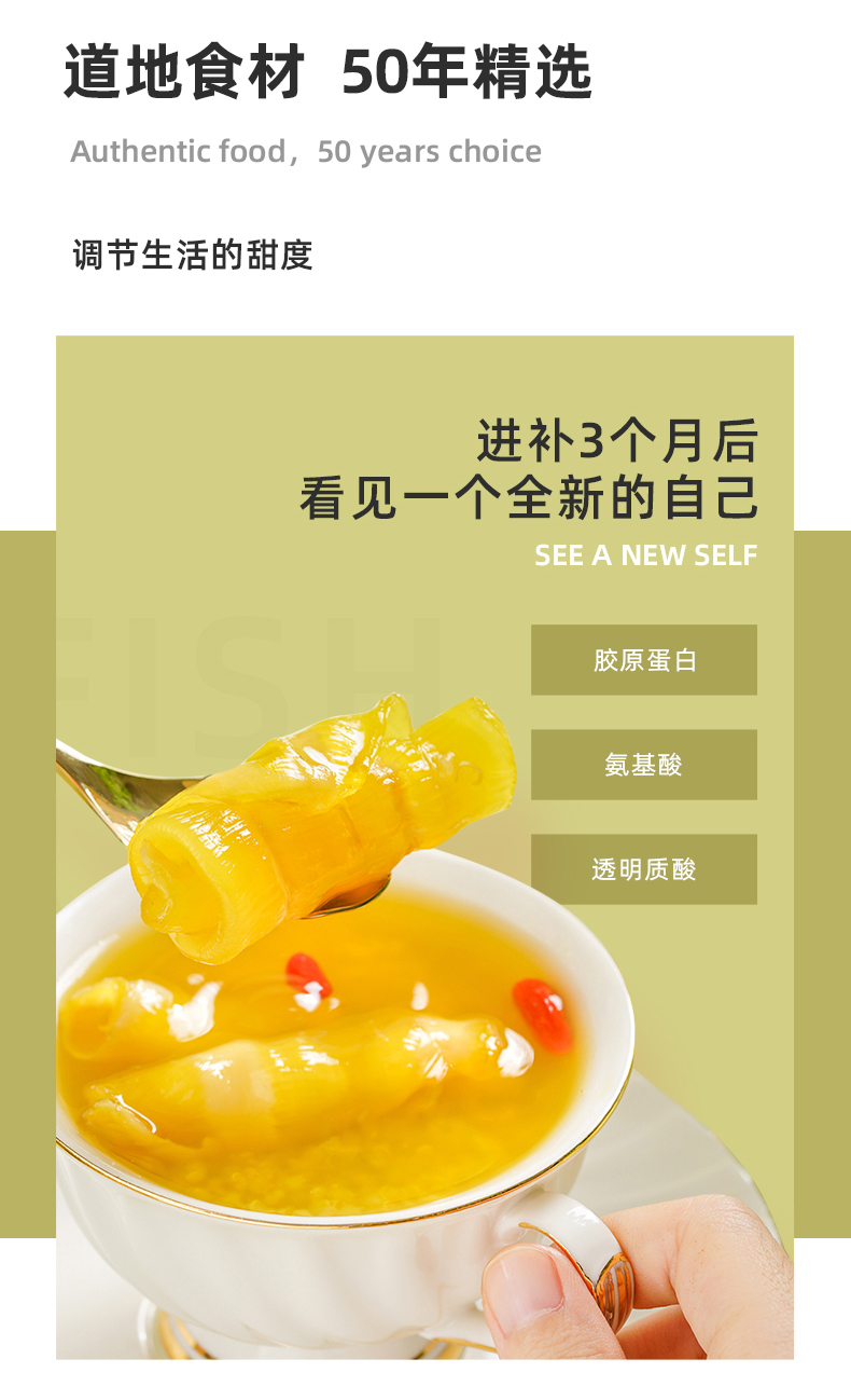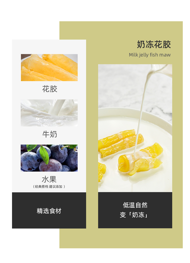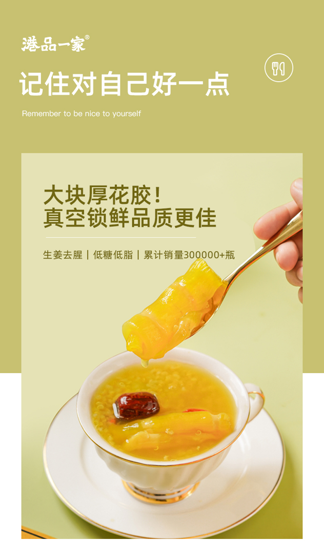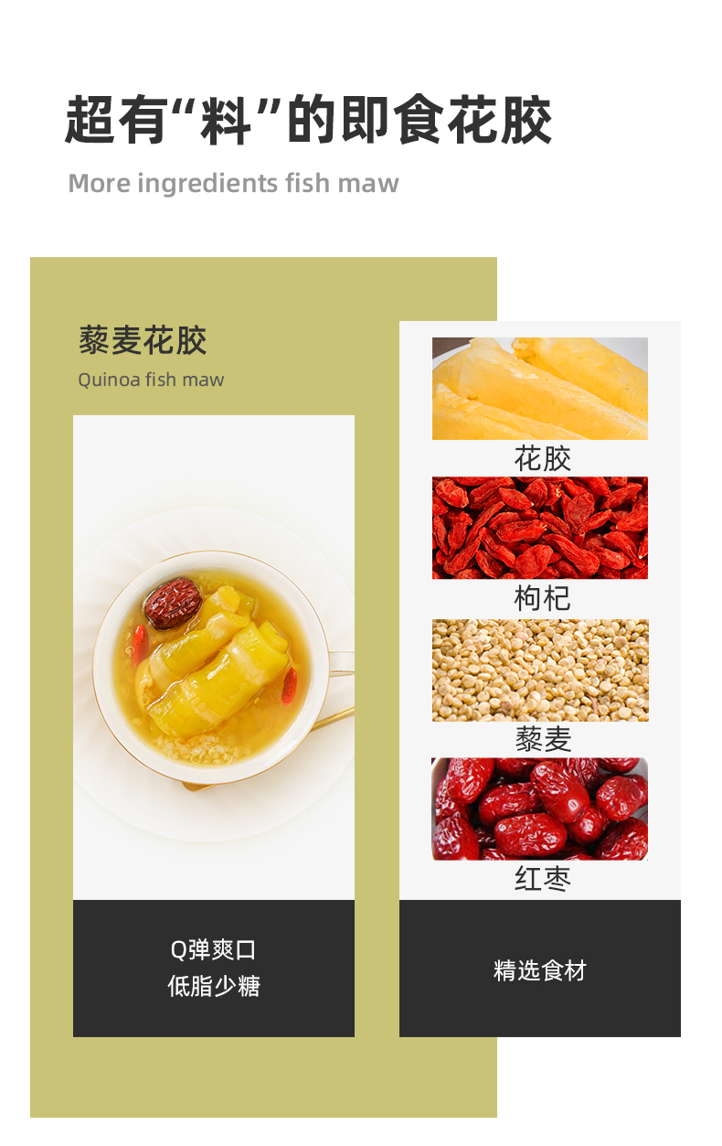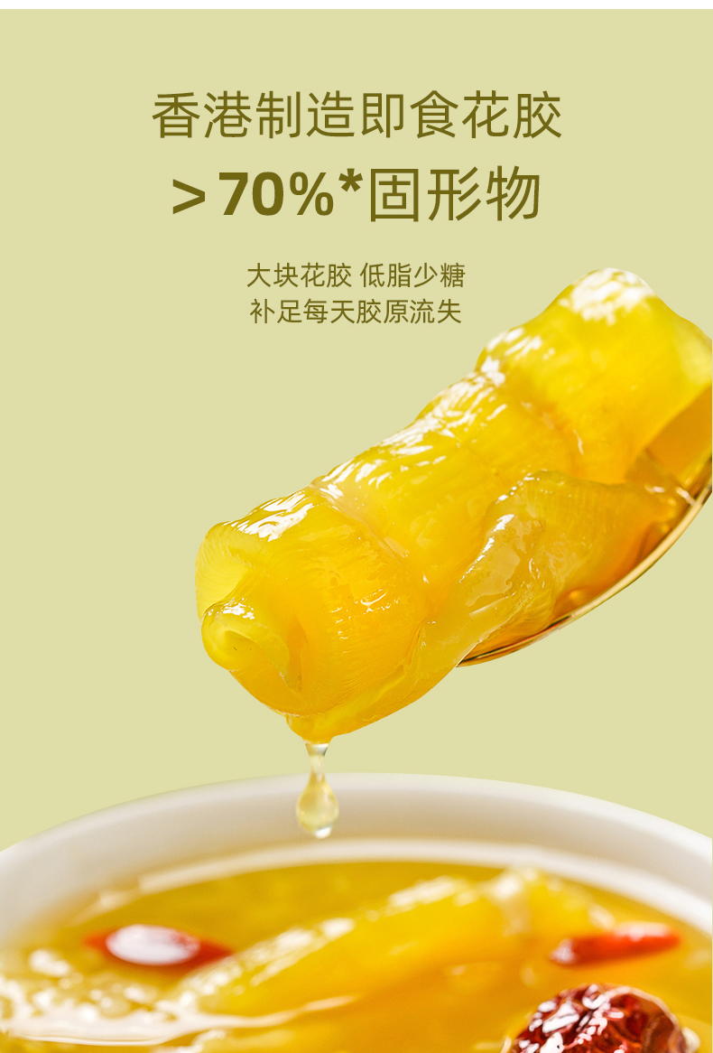选用的深海野生鱼胶的胶质肥厚,有超过70%的固形物,无腥味,脂肪低,口感Q弹,吃起来滑而不腻,不添加防腐剂、添加剂,可以开盖即食,也可加入鲜奶、蜂蜜、水果一起食用,添加具有益气补血、滋阴补颜的功效,男女老少都可服用。