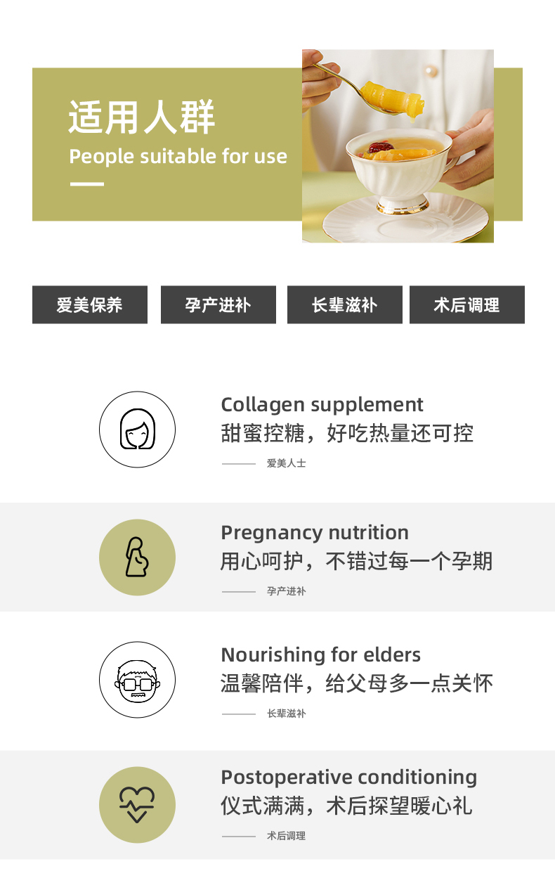 1、需要滋补的女性,有效补充胶原蛋白而且吃后不胖,使肌肤光滑有弹性,孕妇使用可有效滋补,帮助产后恢复。