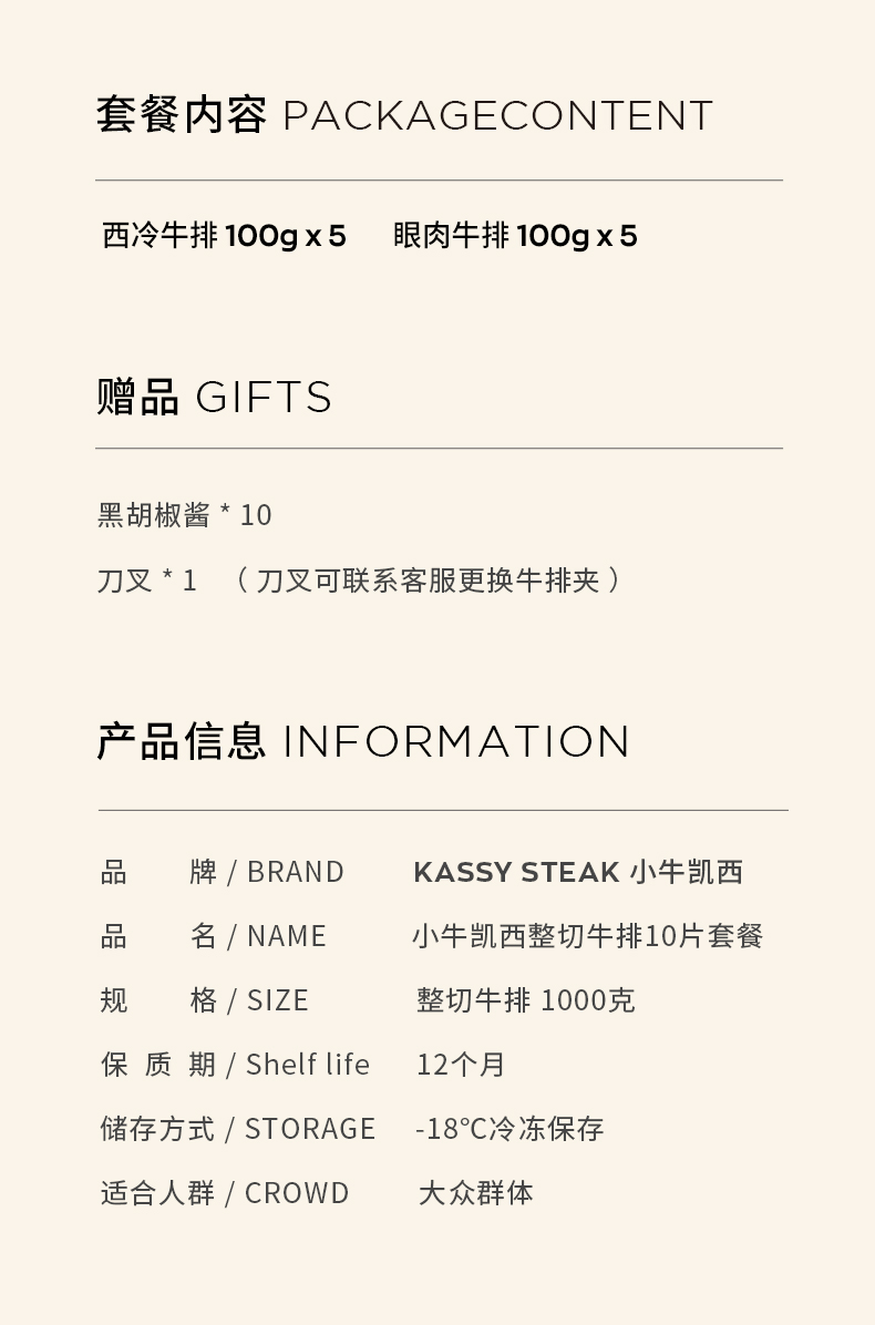 这款小牛凯西 原切牛排套餐,包括:黑椒牛排100g*5片、眼肉牛排 100g*5片,配有黑椒酱10包。