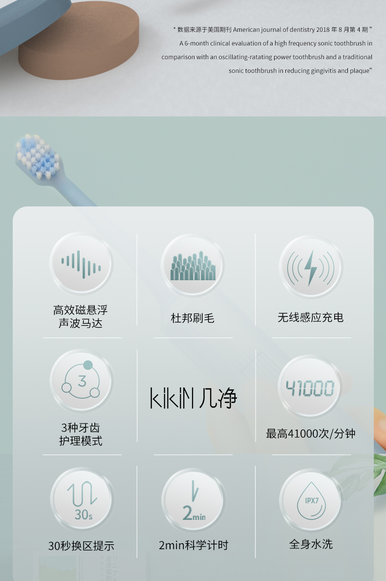 这款电动牙刷是惠百施在中国的代工厂自有品牌—几净出品,刷头用的也是惠百施的专利刷头,刷毛为美国杜邦材质,顶端磨圆处理,刷牙不会损伤牙釉质,分区的软硬刷毛,能更好的清洁牙齿、按摩牙龈,减少口腔问题。