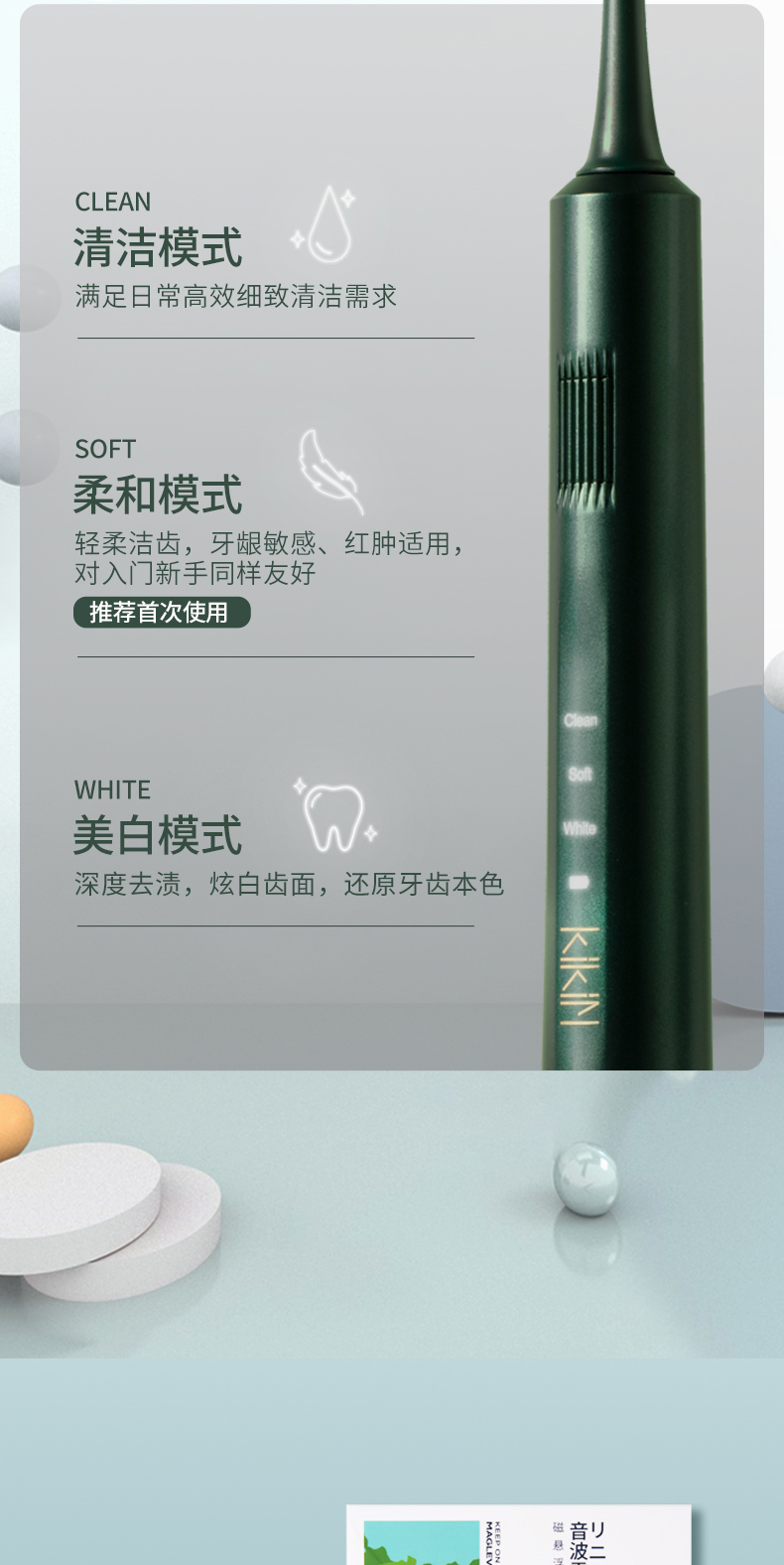 功能方面,自带清洁、轻柔和美白3种震动频率,可依照自我习惯来调节,还标配30秒换区、2分钟科学计时的功能,帮助养成良好的刷牙习惯,IPX7级防水,支持全身水洗,短时间浸泡也不会进水,支持无线充电,自带底座,放下即冲。