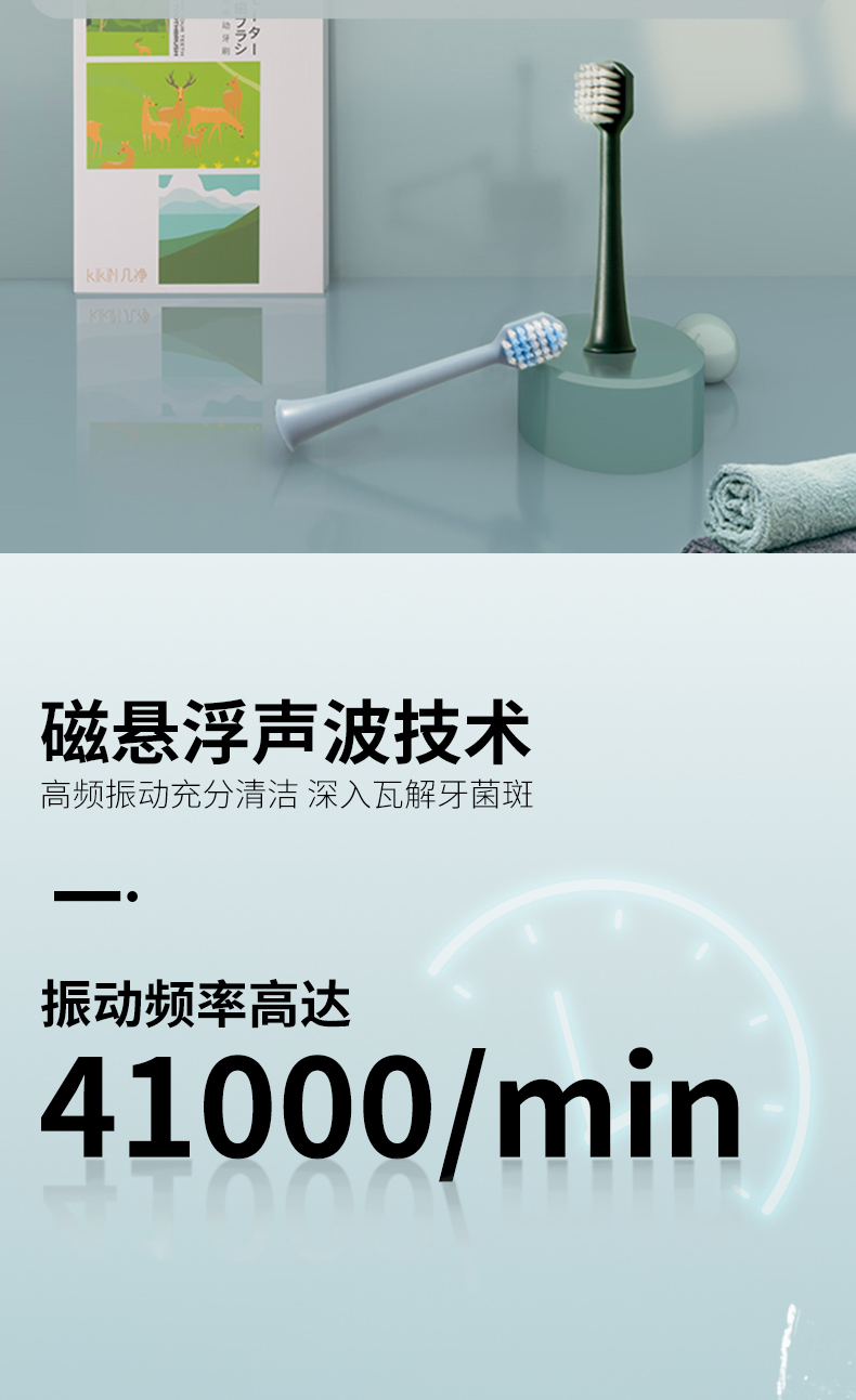 核心的电机方面,使用高效磁悬浮声波马达,最高的振动频率高达41000次/分钟,堪比飞利浦千元以上的电动牙刷,机身轻巧,长时间的握持不酸手,经过专门的设计,传动效率高,不会出现震到手麻的情况。