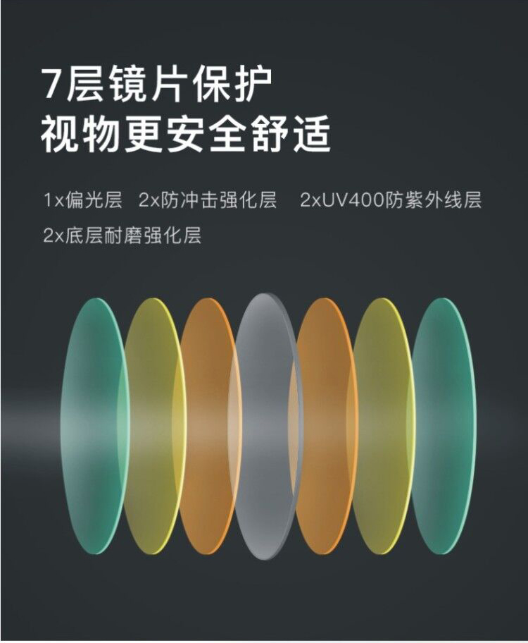 全注塑框架,镜片是拥有UV400防护标准的高清偏光镜片,共分7层,分别是偏光层*1、防冲击强化层*2、UV400防紫外线层*2、底层耐磨强化层。