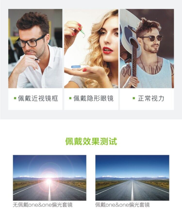 这款oneone 女偏光太阳镜是套镜,近视眼镜佩戴者可以直接套在近视的光学镜架上,对于近视的朋友来说非常友好。如果是隐形眼镜佩戴者或正常视力都可以直接佩戴,适合各类人群。