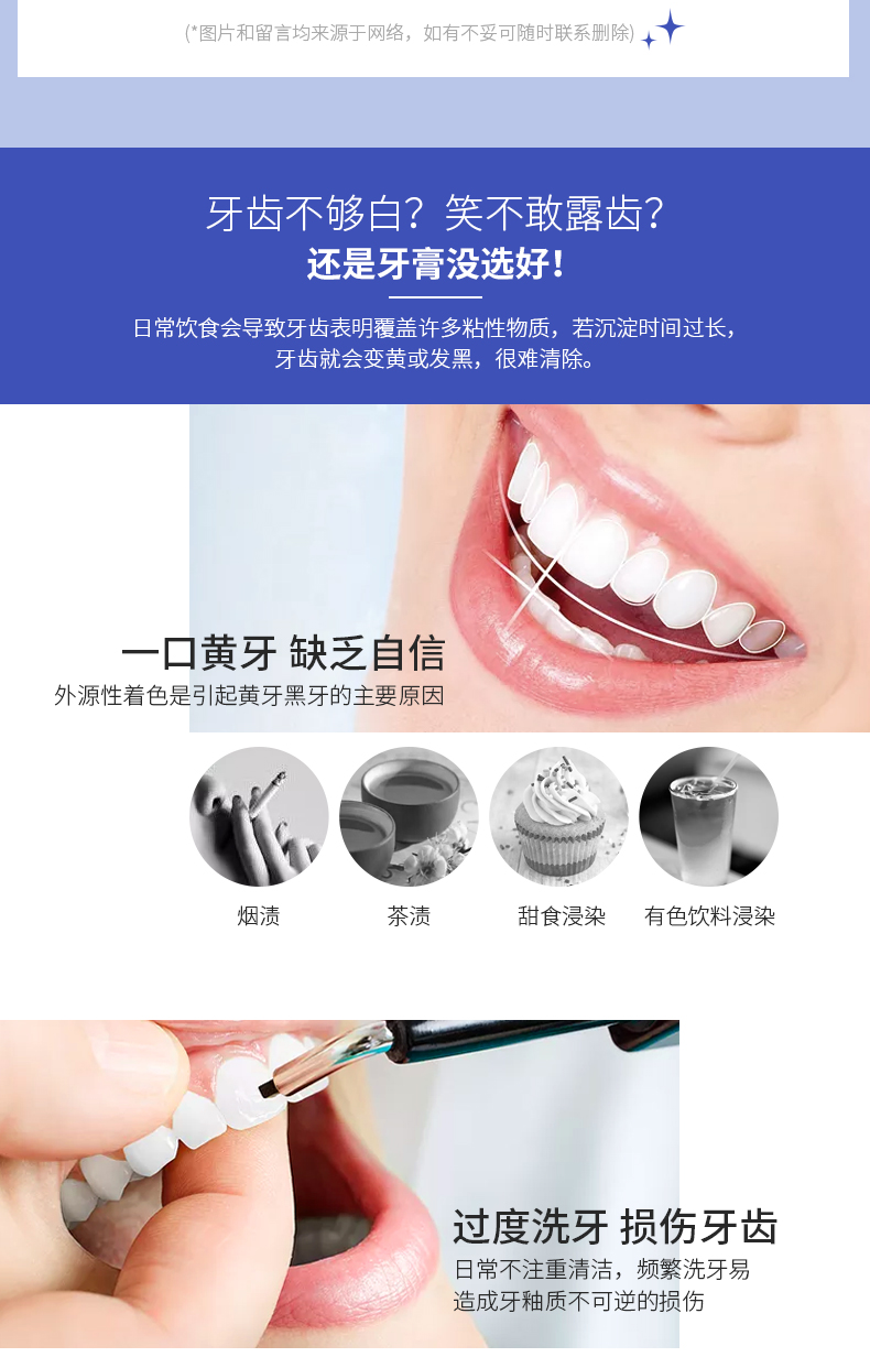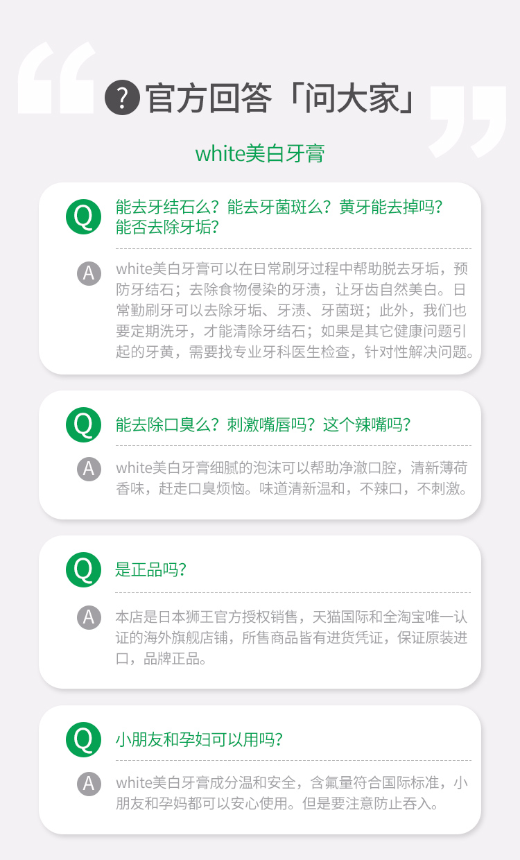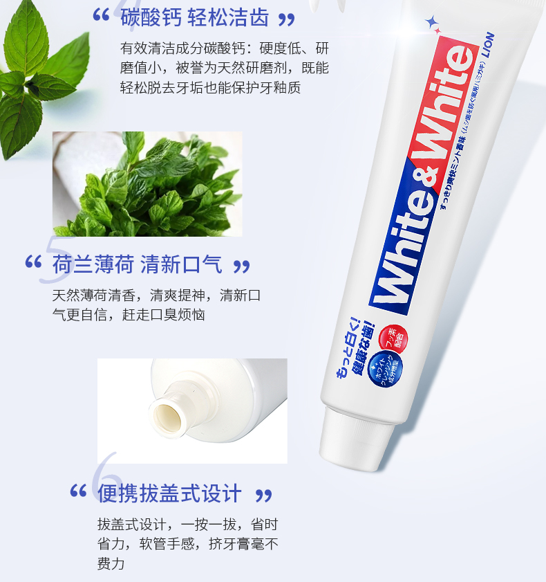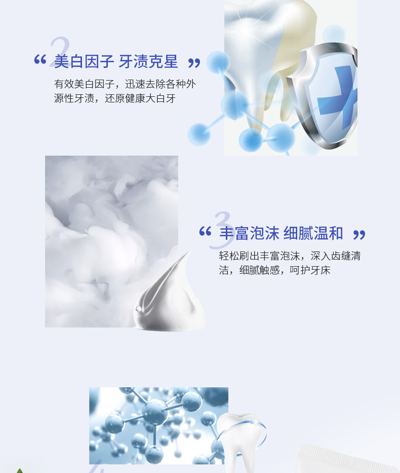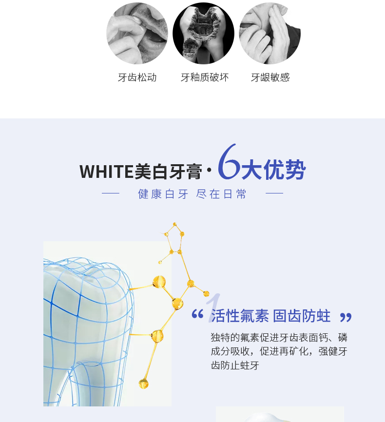 含氟素促进牙齿表面钙、磷成分吸收,促进再矿,强化牙齿;含美白因子可迅速溶解牙垢;含被誉为天然研磨剂的清洁成分碳酸钙,具有硬度低、研磨值小的优点,使牙垢轻松脱落。