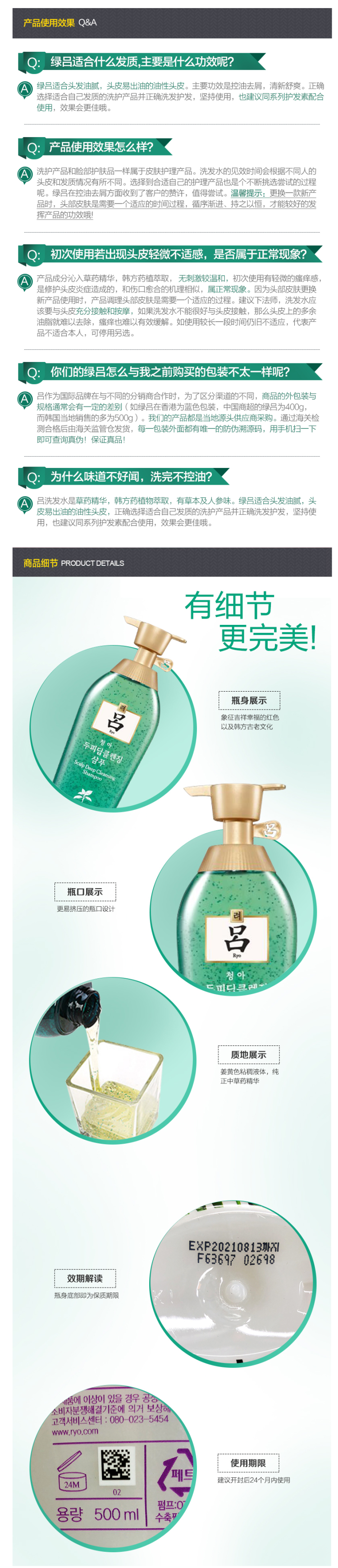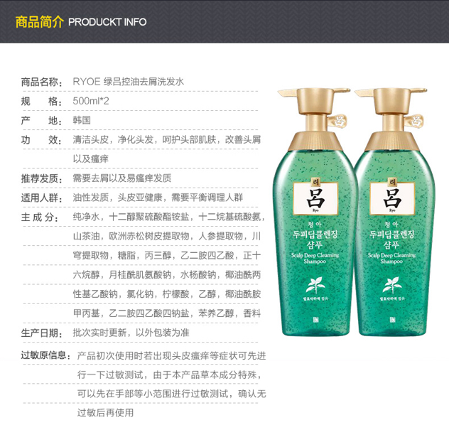这款Ryo绿吕 舒盈清润控油无硅油洗发水/护发素,韩国原装进口,使用无硅油配方,洗发水/深层清洁头皮毛孔,护发素/净化头皮,护理秀发。