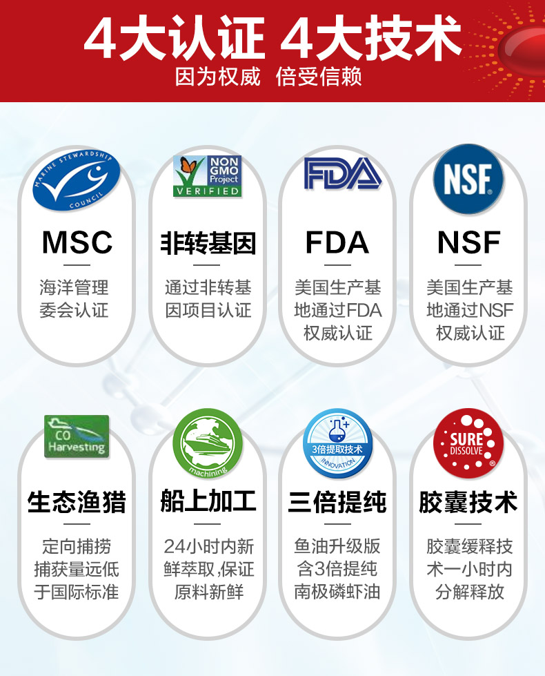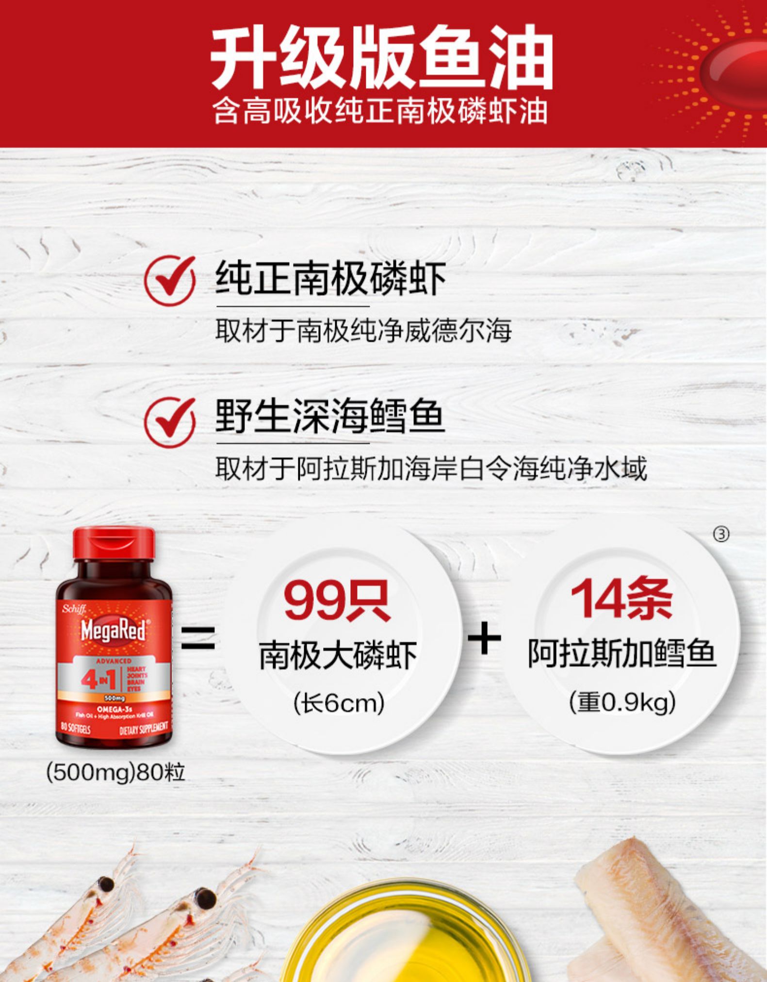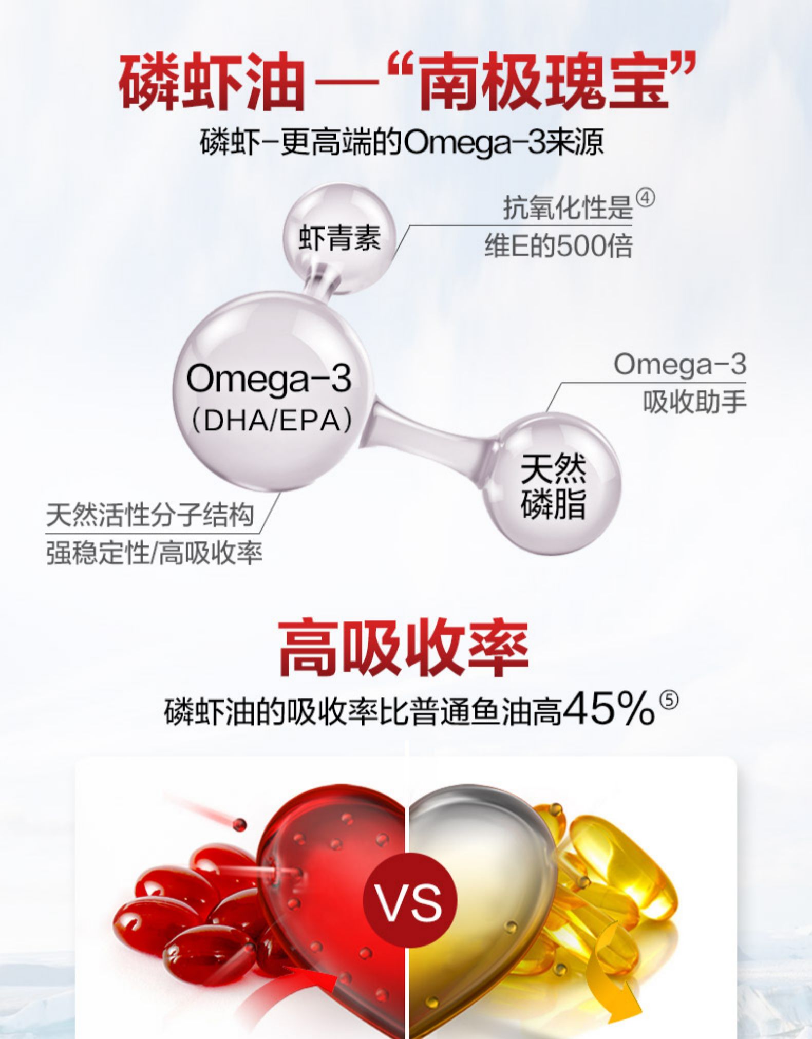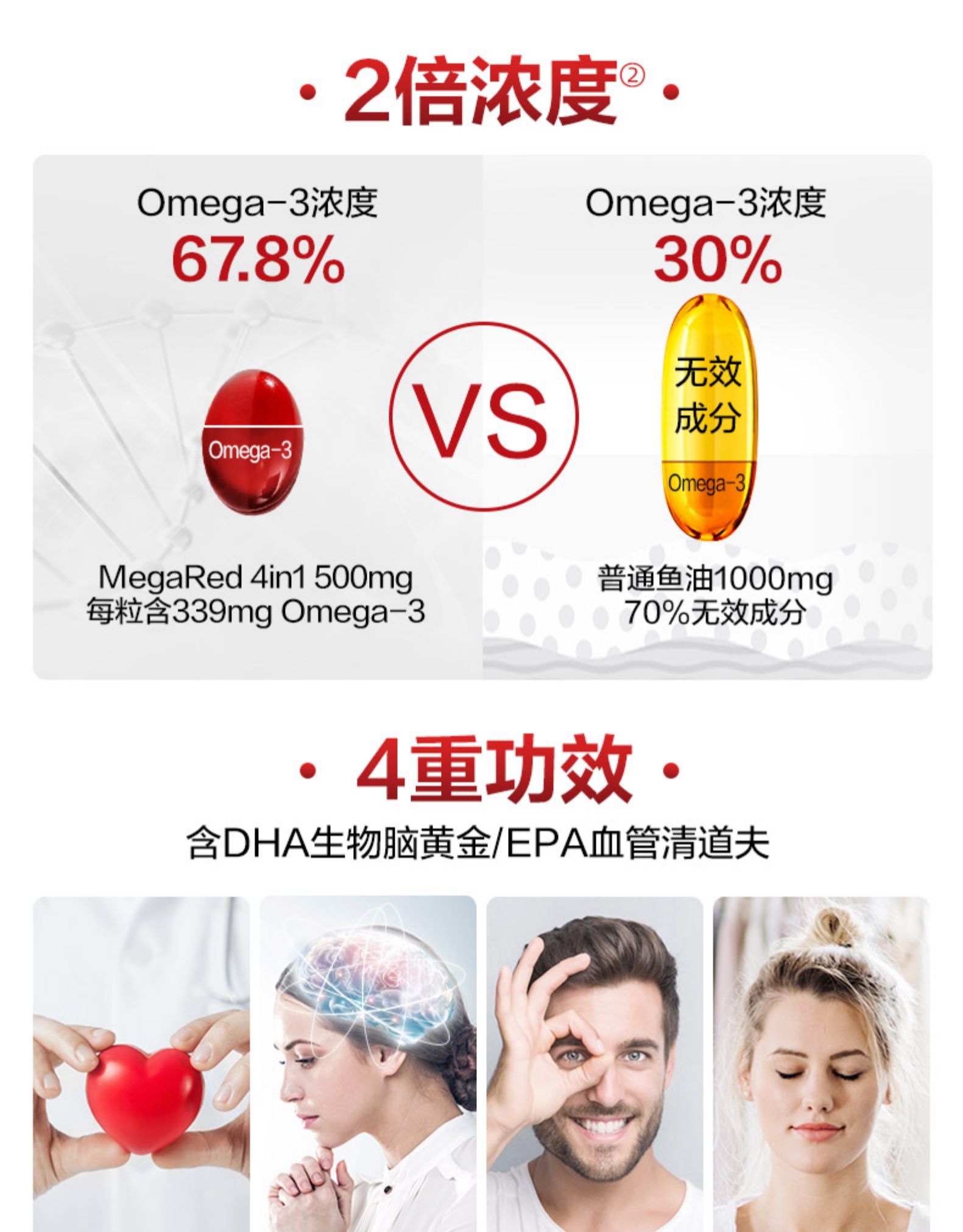 Omega-3:人体所需脂肪酸,有维护增长细胞膜的功能,平滑肌肤,润泽毛发、维护眼睛和脑部健康,抑制肝脏制造三酸甘油酯,降低血脂水平还聚能抗炎作用;