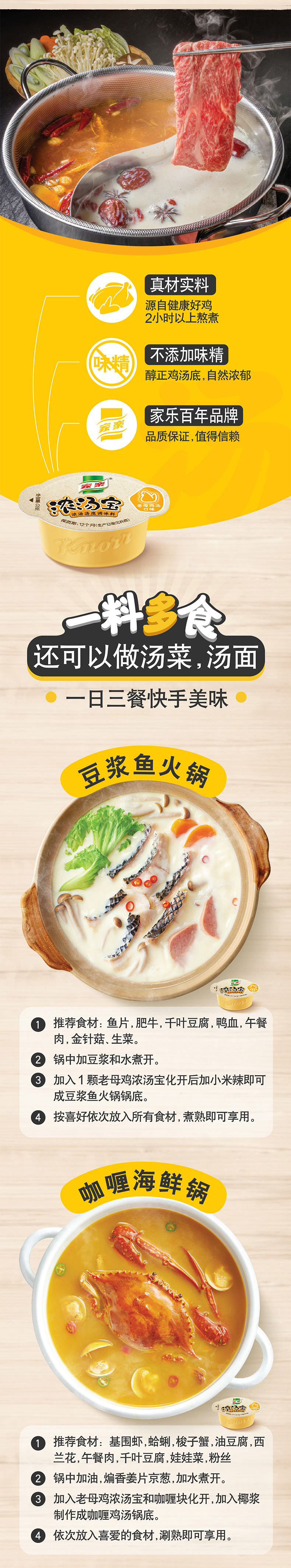 天猫家乐食品旗舰店,15-17日 天猫吃货节,¥29.9元 吃货价,-5元优惠券,=24.9元到手价,老母鸡、猪骨、牛肉、菌菇、清鸡5口味任选,内含8块浓汤宝。线下商超同款,煲汤、拌料放入一盒或者半盒味道非常鲜美。可叠加149-15元 吃货日购物券