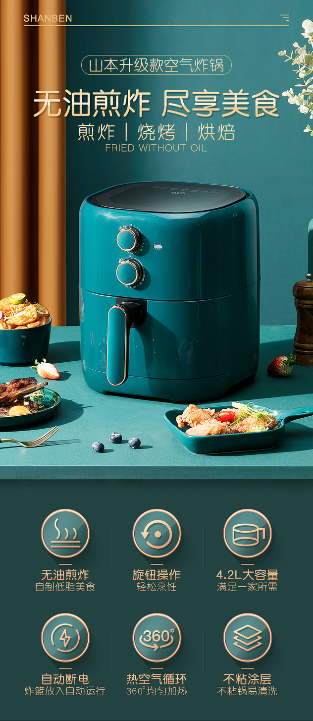 这款是升级第五代,容量4.2L,可无油煎炸、烘焙、烧烤等,功能齐全,同时无油更健康。采用高速空气循环技术,利用食物本身的油脂,360度气体加热渗透,轻松烹饪健康美食;智能操作,可调节温度和时间,一体式导风槽内胆,外层采用不粘锅涂层,清洗方便,经久耐用。