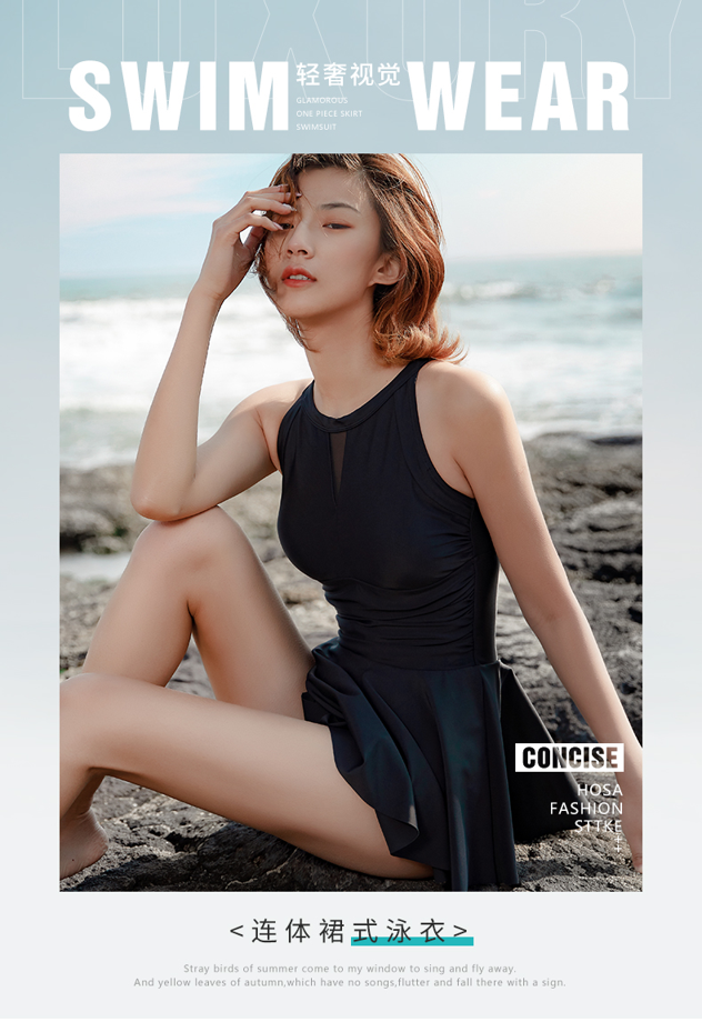 这款浩沙女裙式连体泳衣,拥有性感深V、镂空美背、隐藏赘肉的特点。裙式设计,性感不失保守。胸部与胸部下摆位置是3D褶皱,赋予泳衣层次感,能隐藏赘肉塑造腰线,在视觉上塑造“胸以下都是腿”的感受。镂空迷人美背,简洁利落