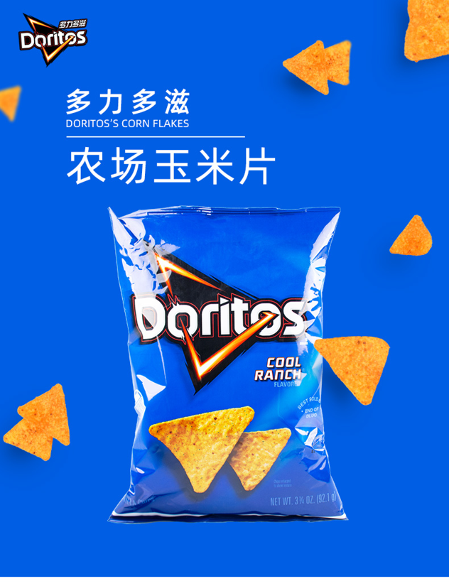 这款多力多滋玉米片是一款膨化薯片,使用本土优质玉米为原料,三角形状,香脆大片,入口咔吱咔吱脆,有奶酪味和农场味可选。