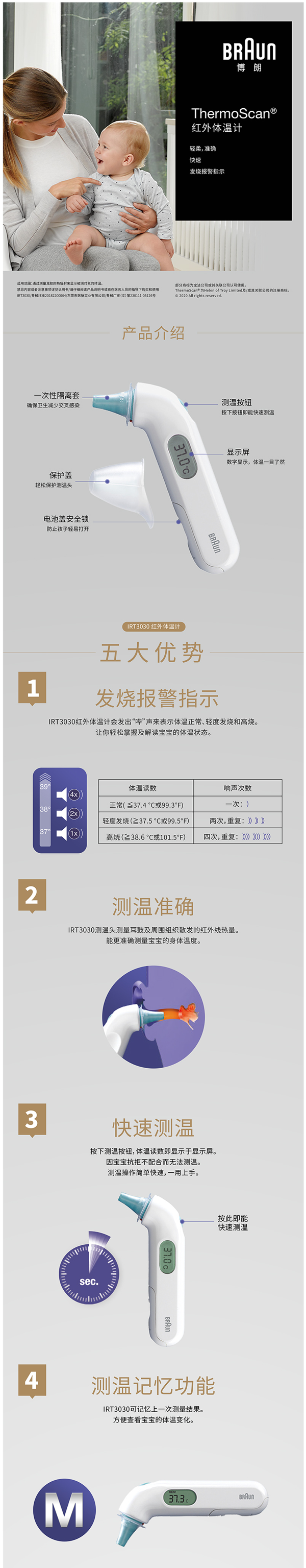 这款博朗Braun IRT3030 宝宝耳温枪,主要通过测温头测量耳鼓及周围组织散发的红外线热量,来准确测量宝宝的身体温度。