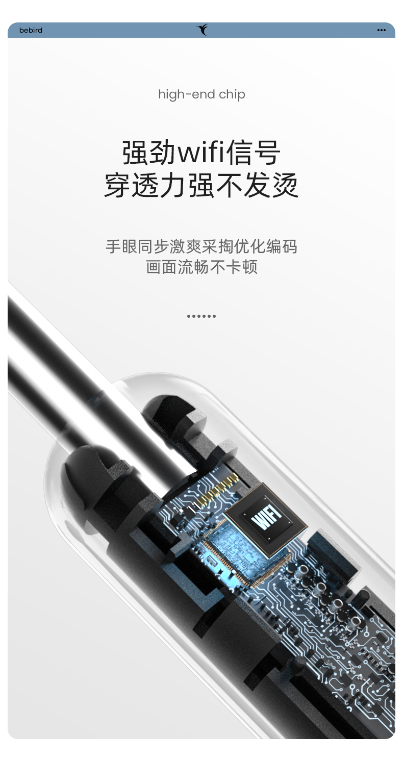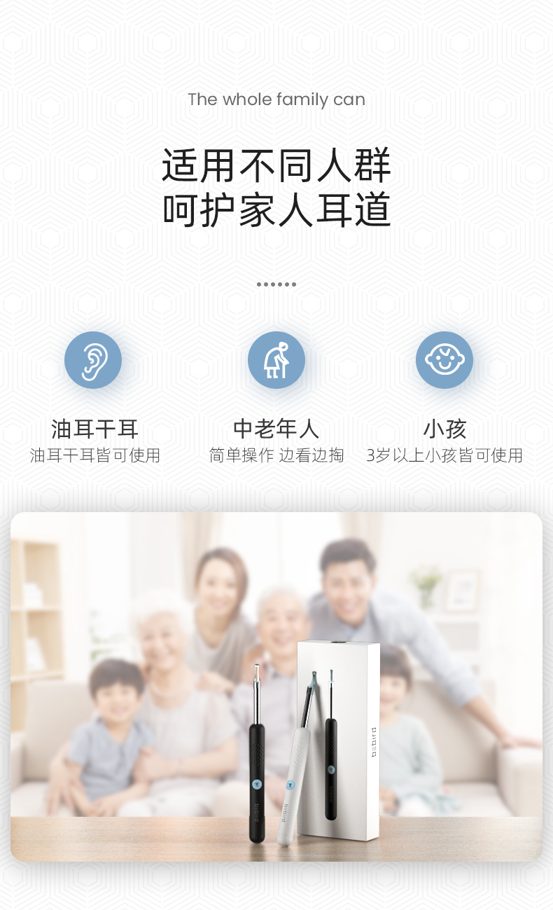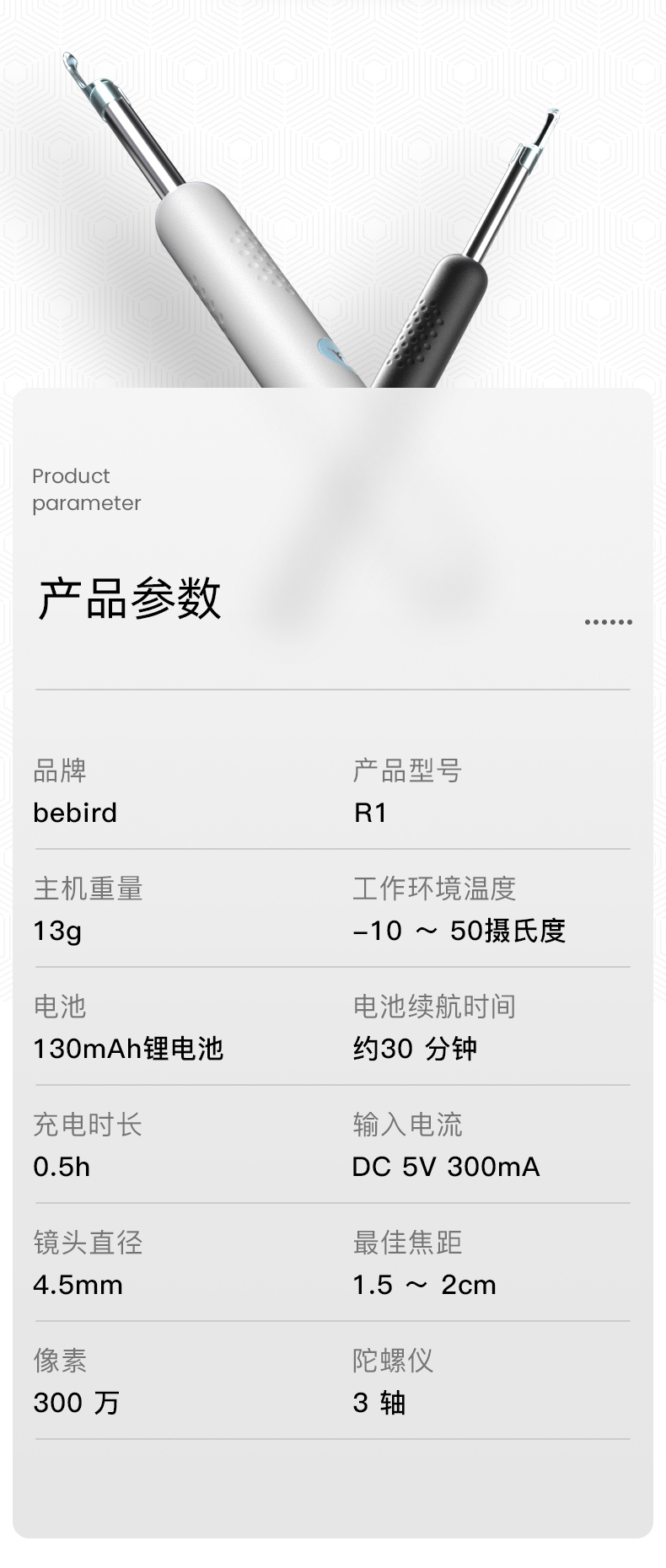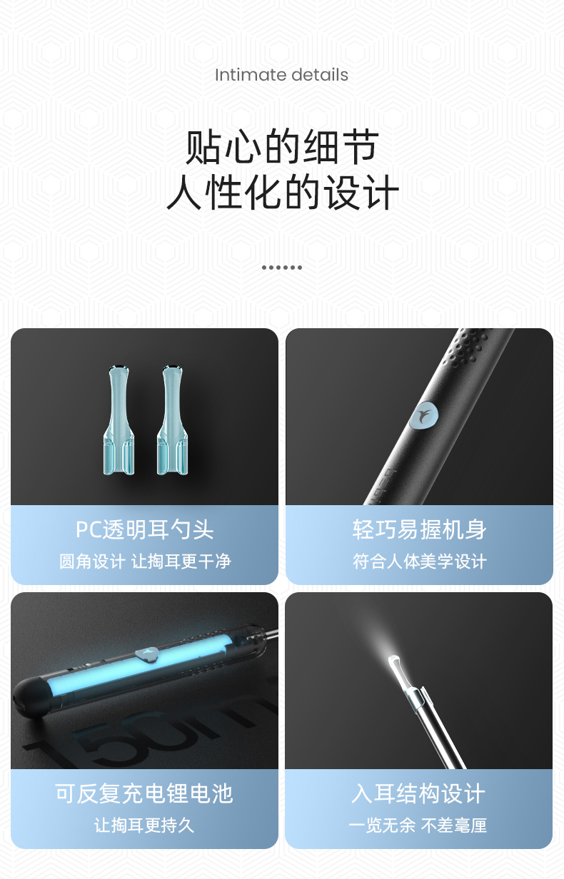 这款蜂鸟采耳智能可视采耳棒内置300W像素的内窥镜,3轴陀螺仪精准定位,画面不虚不晃,采耳更安全,内置极速WIFI芯片,信号稳定,画面不卡顿不掉帧,而且还有双重温控系统,不会使人体感觉不适。