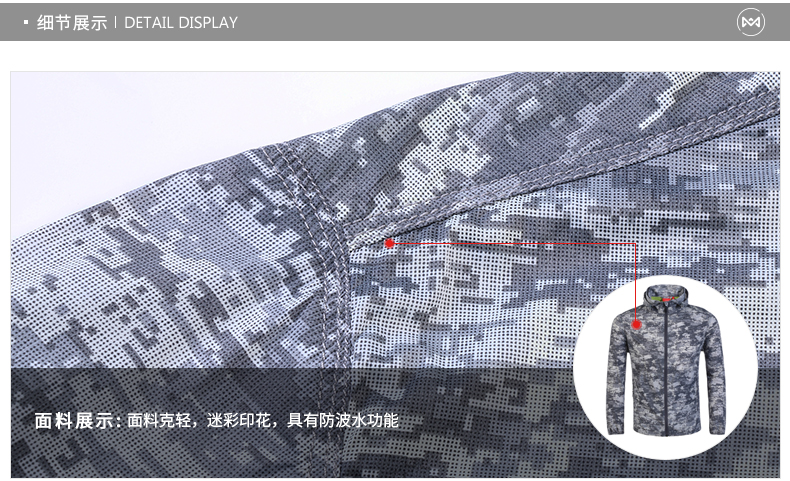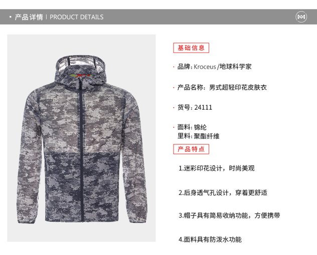 这款皮肤风衣使用100%超细尼龙面料,强度好,防撕裂,重量轻,防风、抗污,迷彩纹印花,非常帅气,适合男生穿。