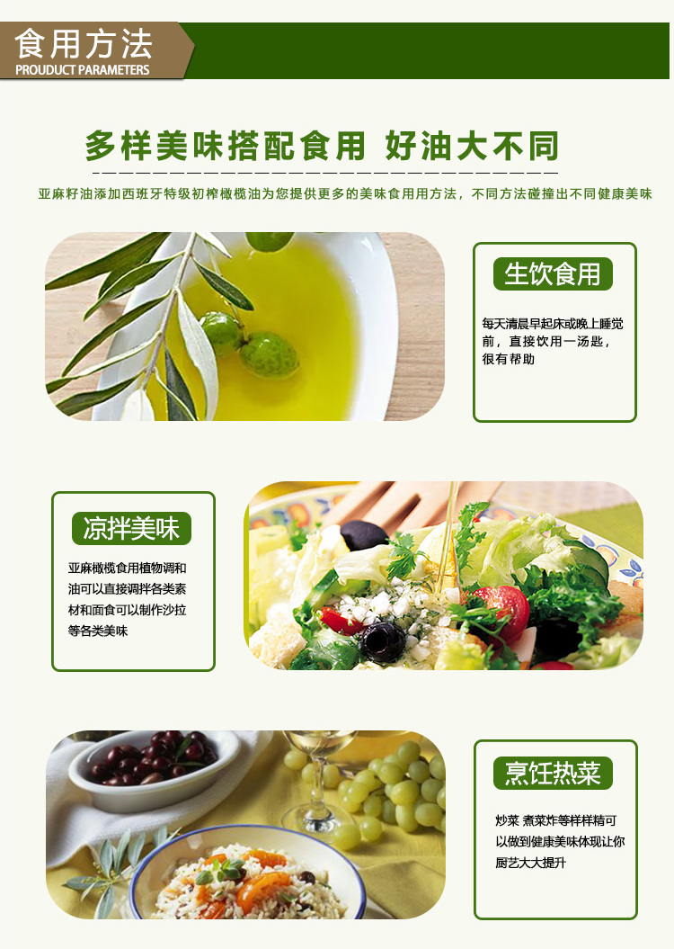 亚麻籽油,顺滑可直饮,a-亚麻酸是多不饱和脂肪酸,是人体必不可少的营养素之一,完全适用于所有人群,并且可用于厨房烹饪,煎炸,烧烤,凉拌等。