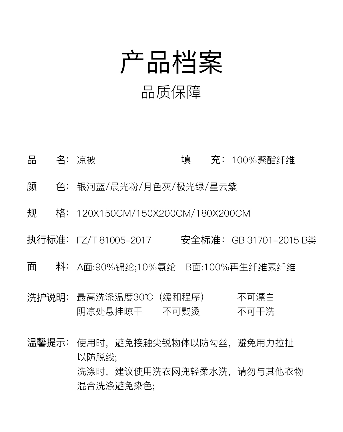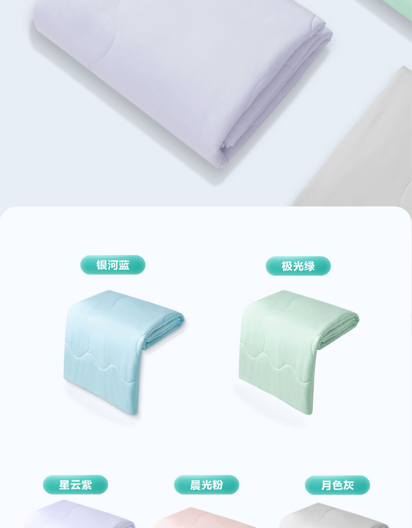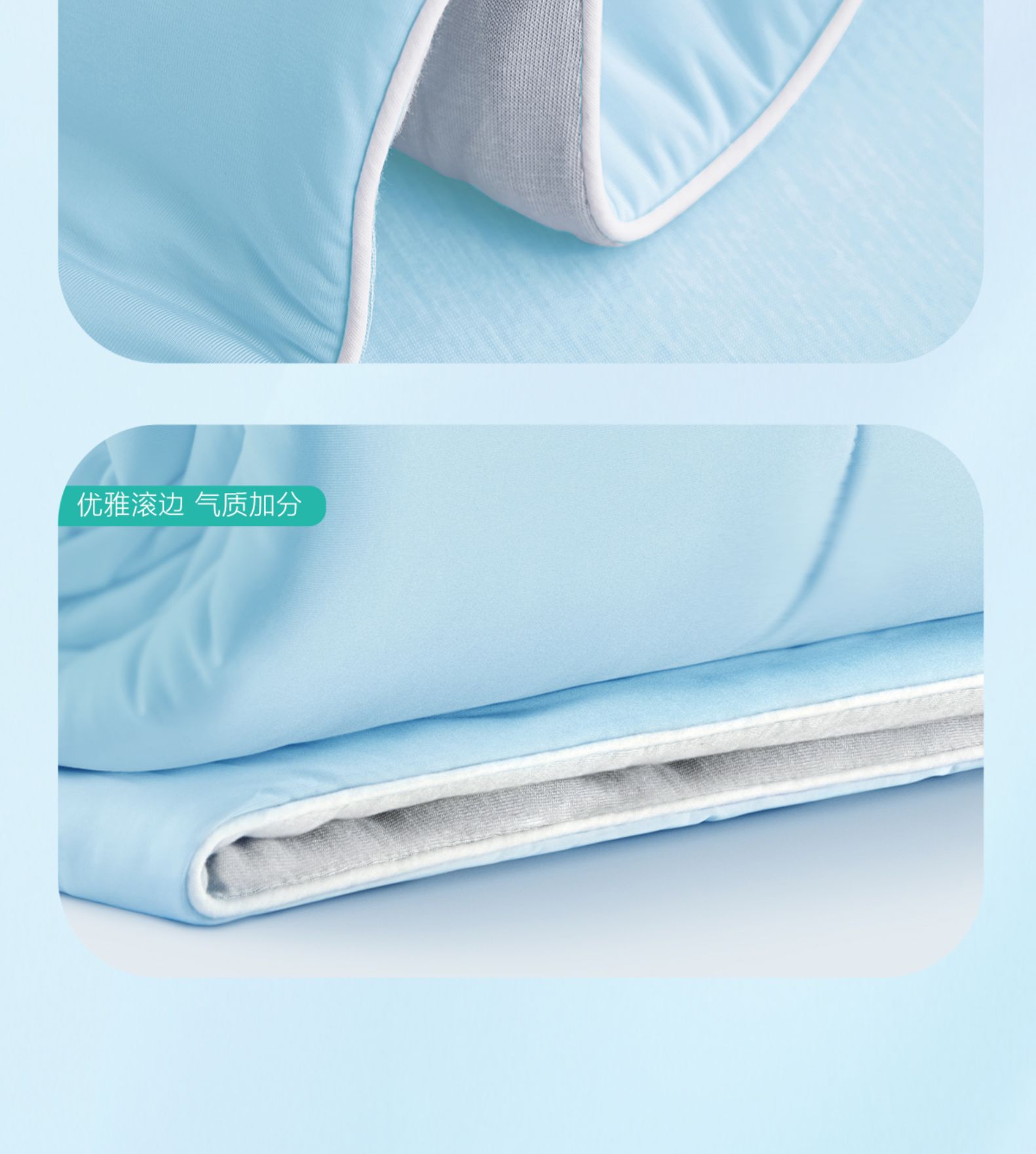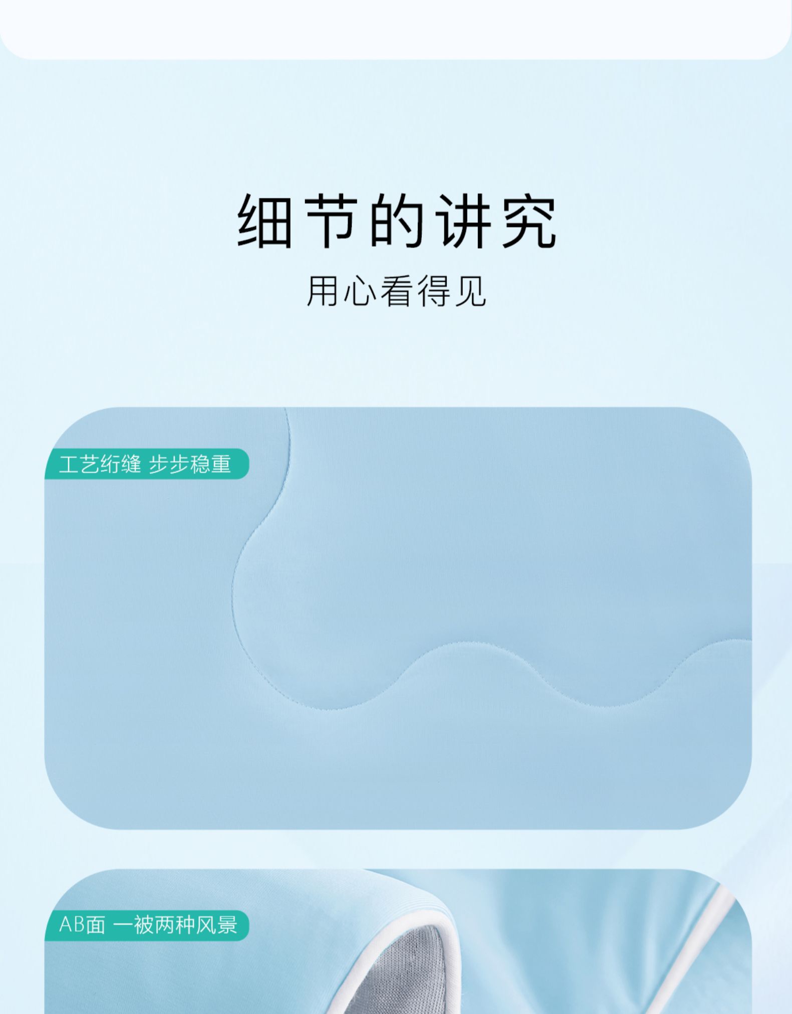 面料50D超密针织工艺,柔软亲肤,如丝般柔滑细腻,内里整张聚酯纤维填充,轻盈透气。整体做工精细,不跑棉不变形,可放心机洗打理方便,洗涤最高温度30℃,采用活性印染、无甲醛、无致癌芳香胺,可放心裸睡。