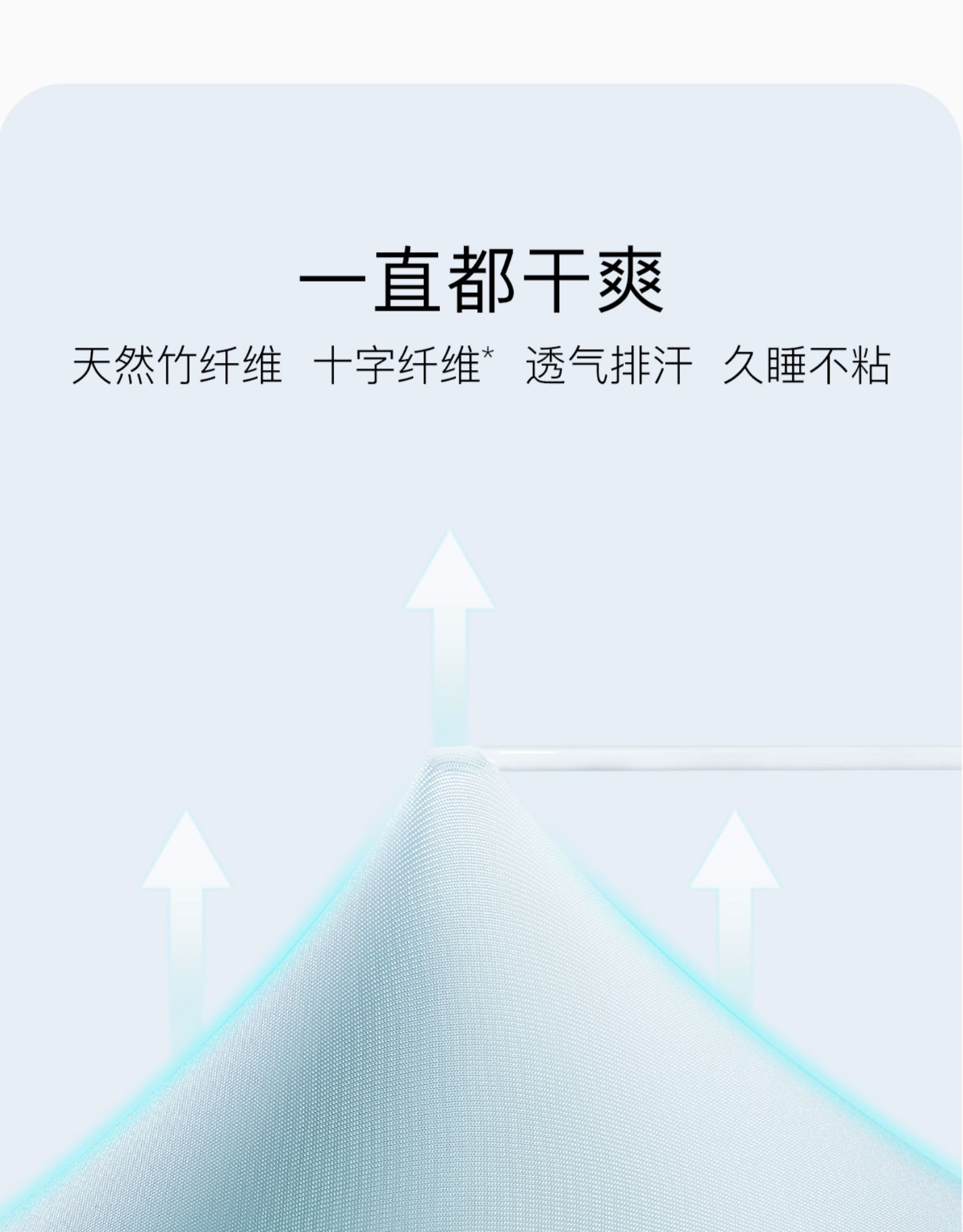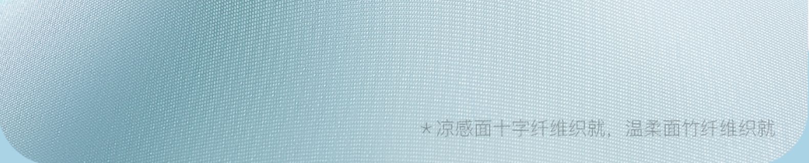 B面:面料提取自竹子的天然竹纤维,十字纤维工艺比普通纤维的比表面积更大,和皮肤接触面也更大,触感柔顺,具有极好的透气性、和吸湿排汗性,可充分吸走汗湿干爽不黏腻。
