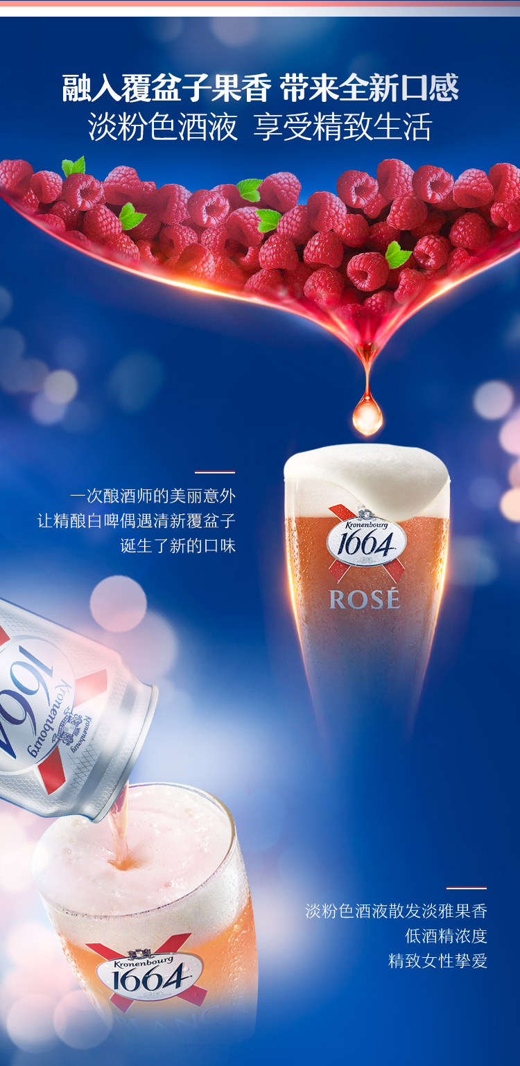 这款1664桃红小麦啤酒,使用法国亚尔萨斯省的特种啤酒花Strisselspalt,泡沫细致,融入覆盆子果香,带来全新口感,酒液呈现淡粉色,散发着淡雅果香。