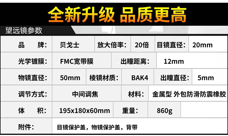 天猫贝戈士旗舰店228元,可领60元优惠券,实付168元到手,俄系大保罗,20倍大口径,5年坏了免费换新。送价值35元的手机拍照夹黑色软包+擦镜布+专用肩带+专用防尘盖。俄罗斯军工正品,20高倍超清,传承俄系经典,FMC宽带多层镀膜,自带微光夜视功能,高档光学菱镜,50mm超大口径,防水防雾,金属镜身,防滑皮革。