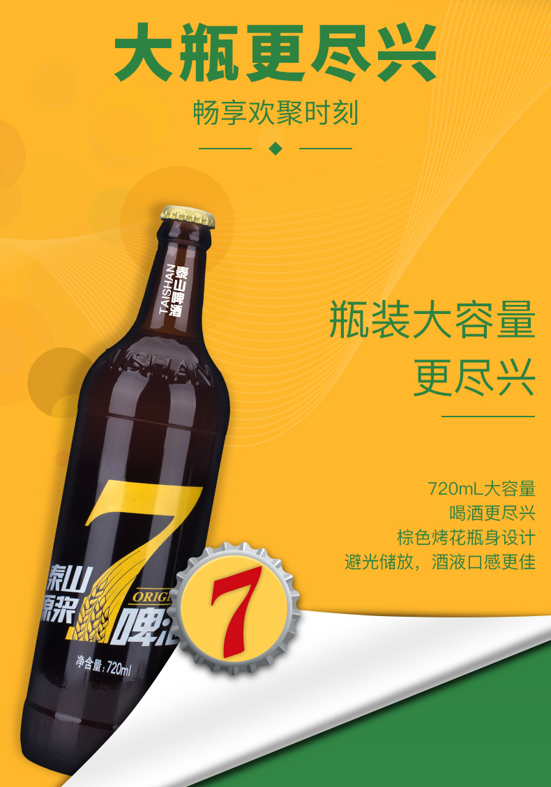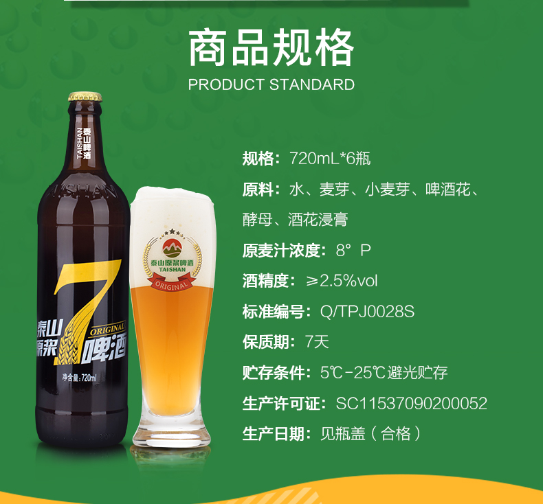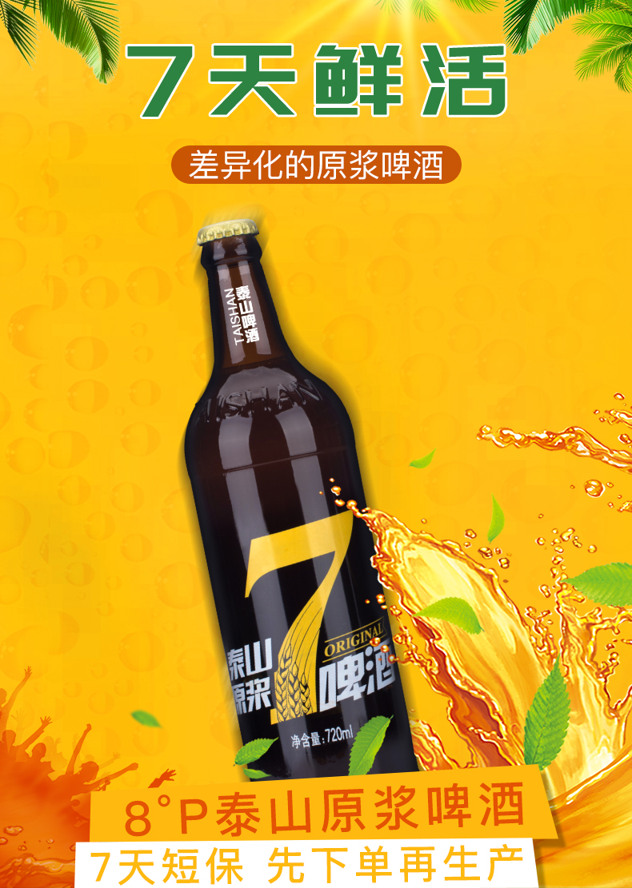 这款泰山啤酒 8°P 7天原浆啤酒,720ML大瓶装装,使用德国设备和发酵工艺,精选澳洲大麦、新疆啤酒花、德国上面酵母及泰山地下水酿造而成,酒精度≥2.5%vol,原麦汁浓度8°P,未经过滤,保留酵母,好喝如同现酿,口味纯正干爽,泡沫丰富。