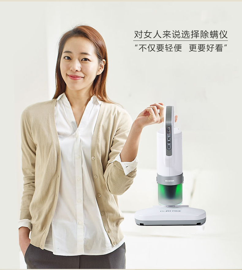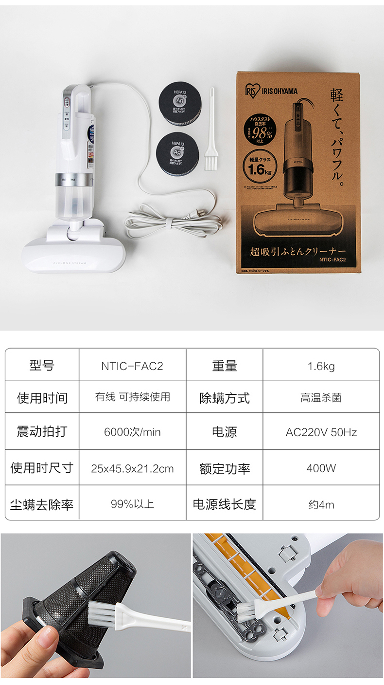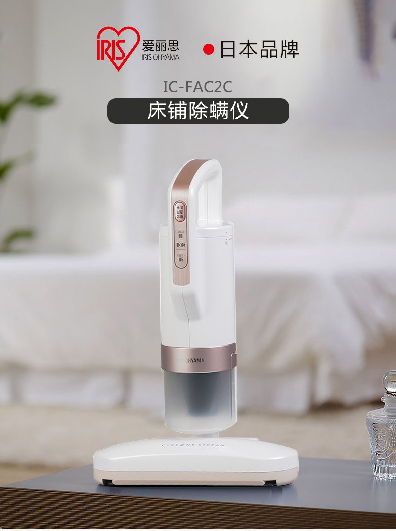 这款爱丽思 IRIS IC-FAC2C 手持式家用床铺除螨仪,是有线的,虽然限制了使用范围,但是可一直使用,400W的功率稳定,吸力不会出现变小的情况;有温风抑螨、高频拍打、强力吸尘、灰尘感知功能;