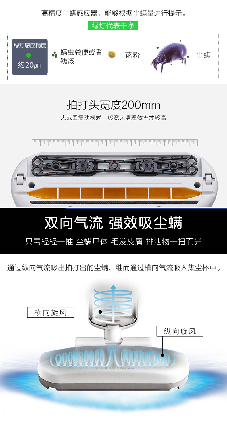 高频拍打:6000次/分的高频拍打,大范围的高频震动将潜伏再被褥中的灰尘和螨虫吸出来;