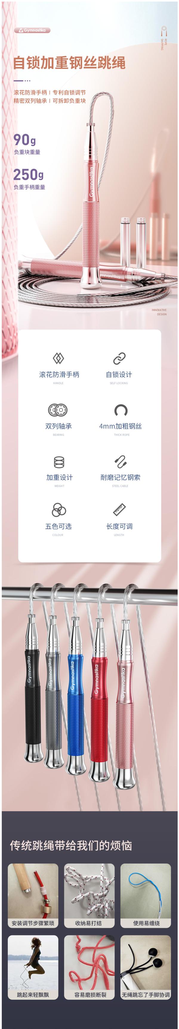 这款戈那斯Gymnas 自锁轴承钢丝跳绳,属于竞速自锁跳绳,手柄上可负载90g的负重块,提高运动效果。一体成型铝合金手柄,结实耐用,外层滚花雕刻工艺,握感舒适防滑。