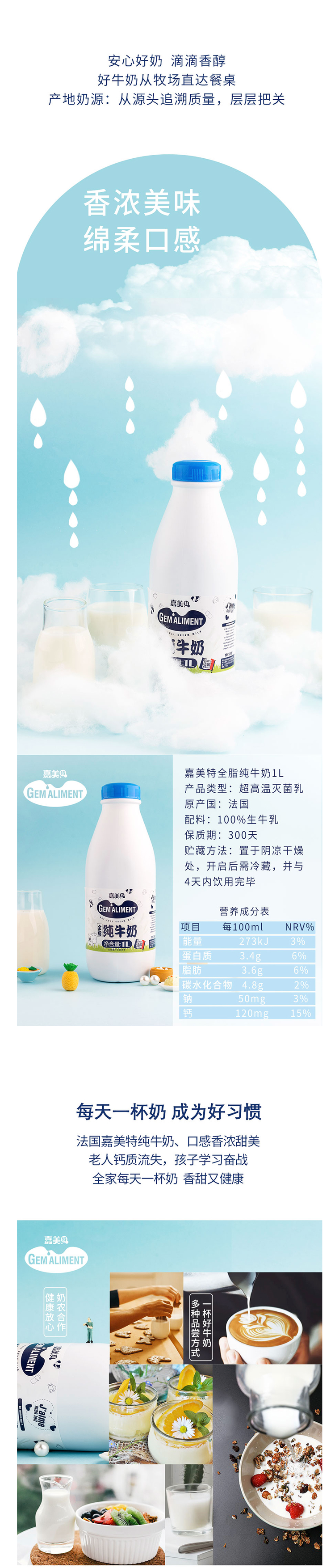 这款嘉美特 全脂纯牛奶,法国原装进口,奶源是自家牧场的优质100%生牛乳,每100ml牛奶中含120mg的钙、3.4g的蛋白质,营养价值完全达标,牛奶清醇不油腻,口感绵软香甜。