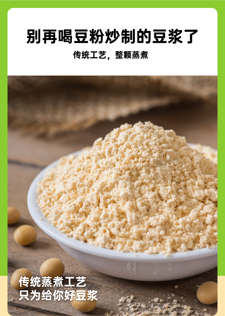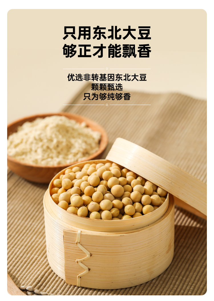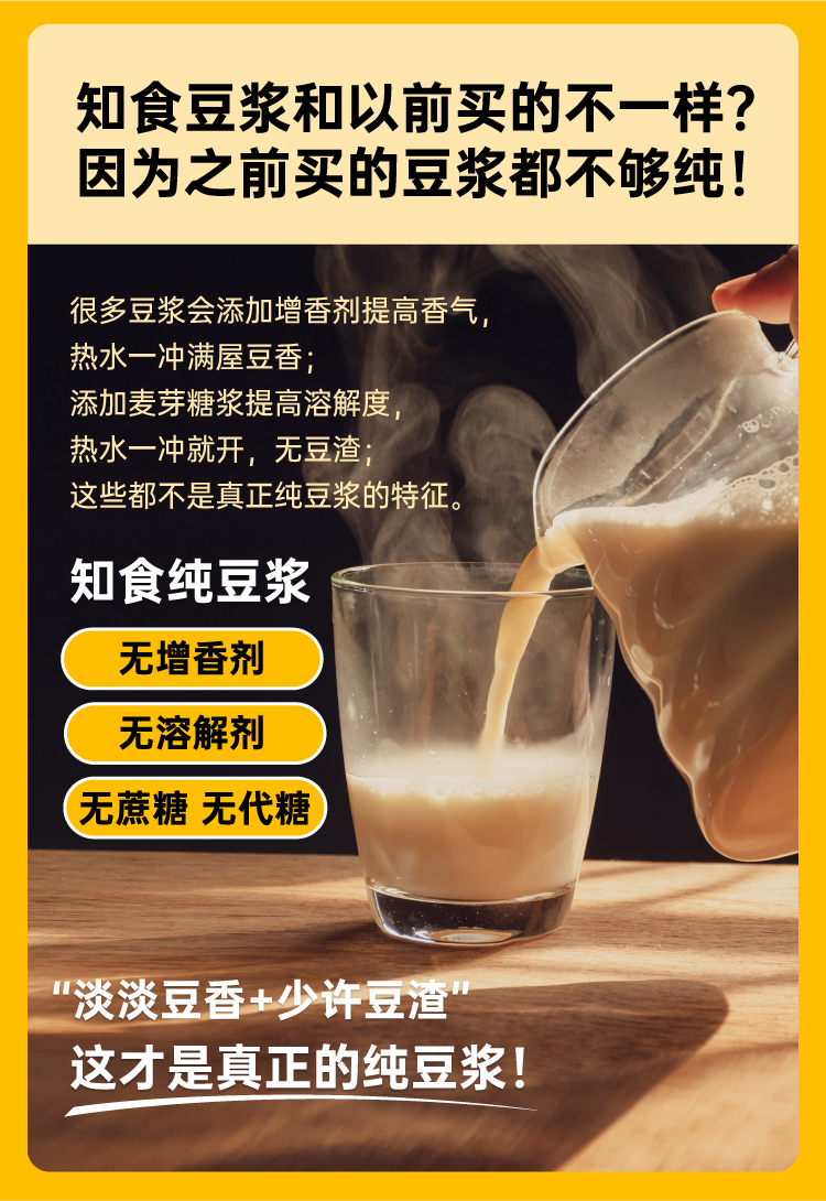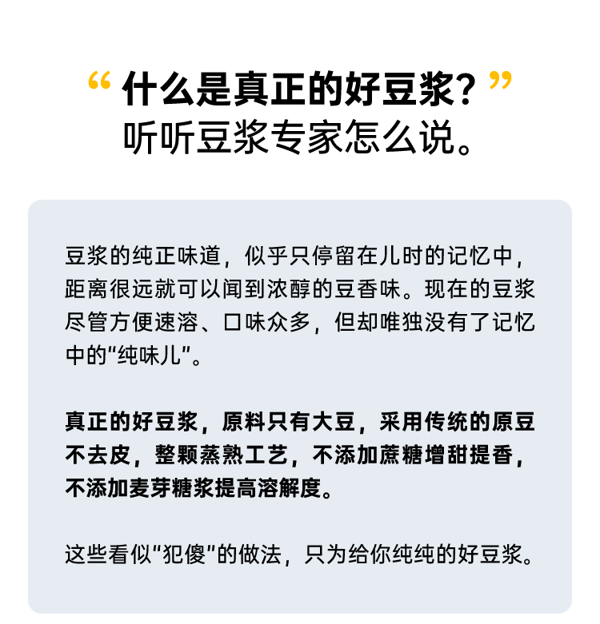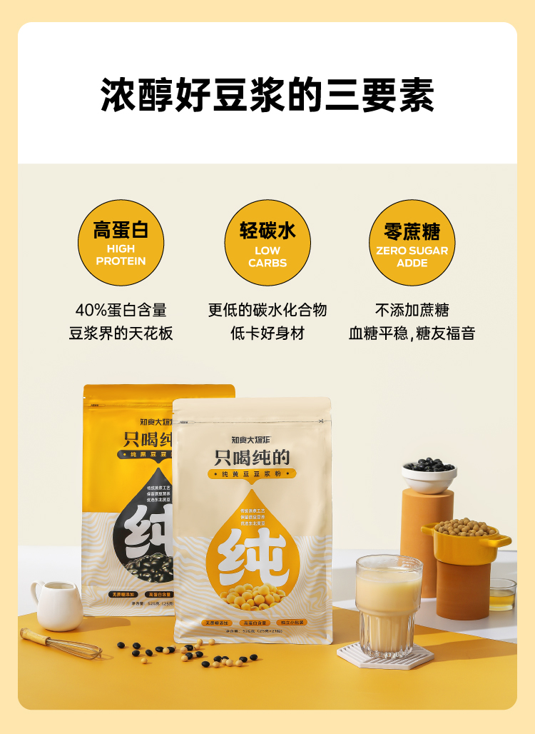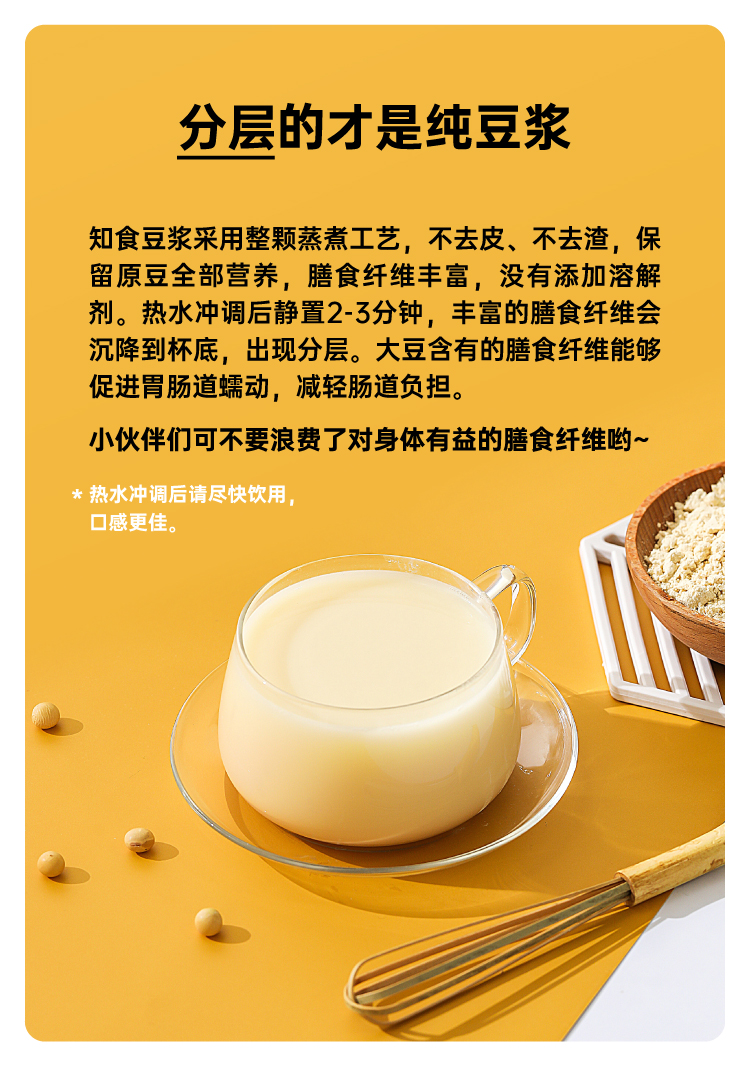 市面上一般的纯豆浆粉为了省事,大多是采用黄豆打粉后炒制的工艺,价格虽低,但会额外摄入油脂,而且容易出现带糊味的问题,这款知食大爆炸纯豆浆采用传统的原豆不去皮,整颗蒸熟工艺,不添加蔗糖增甜提香,不添加麦芽糖浆提高溶解度,不含反式脂肪和胆固醇,杯杯都是好豆浆。