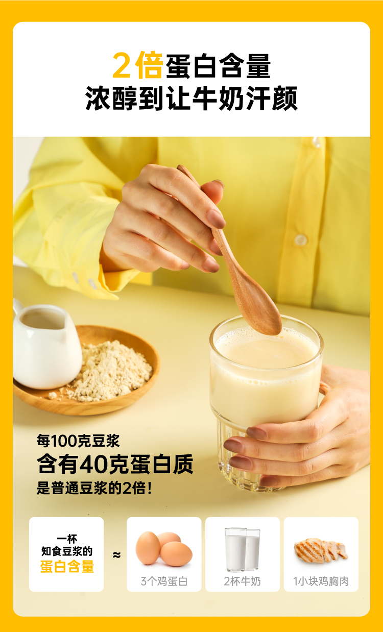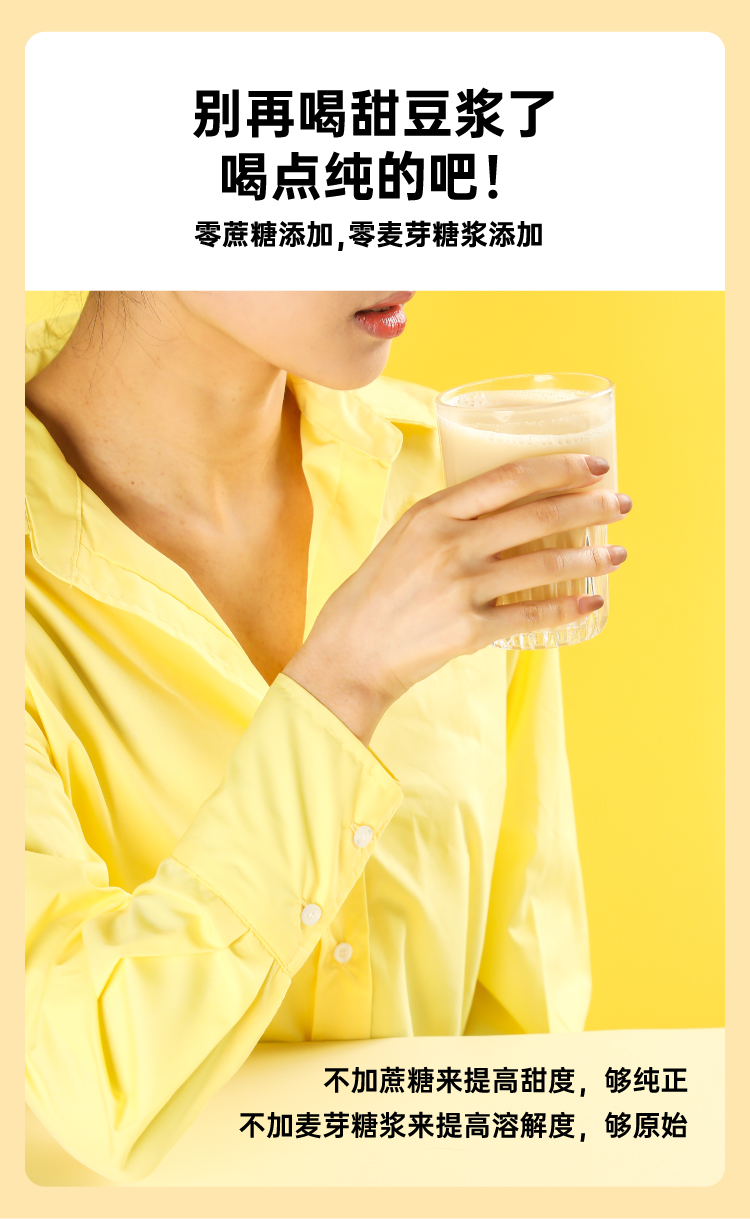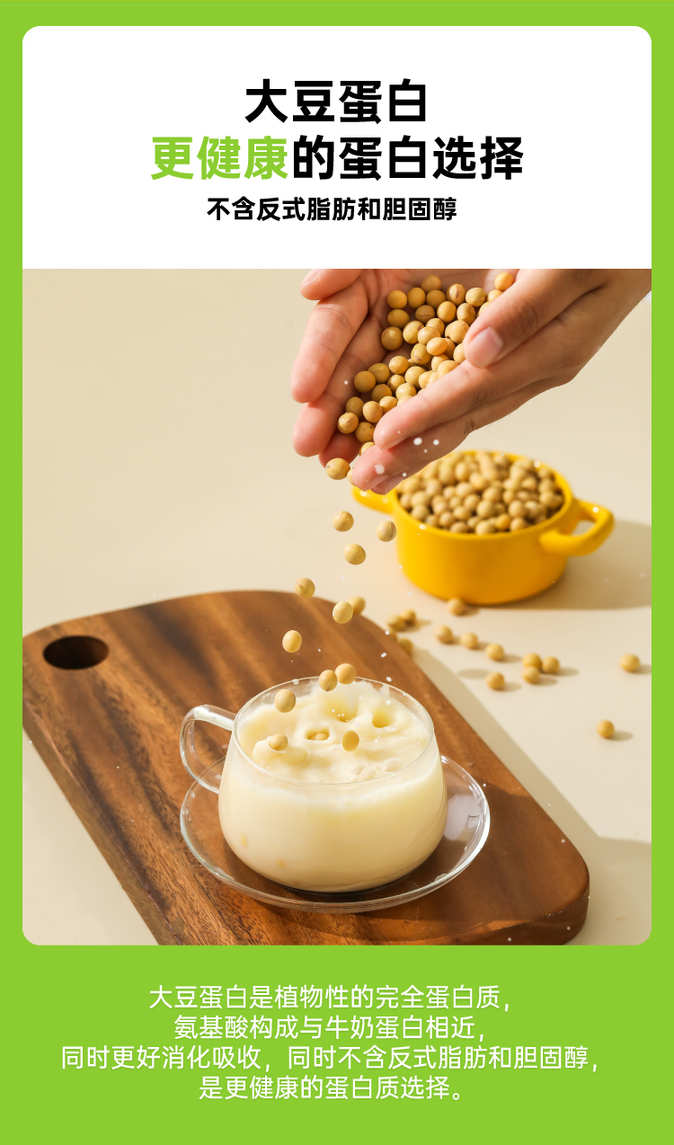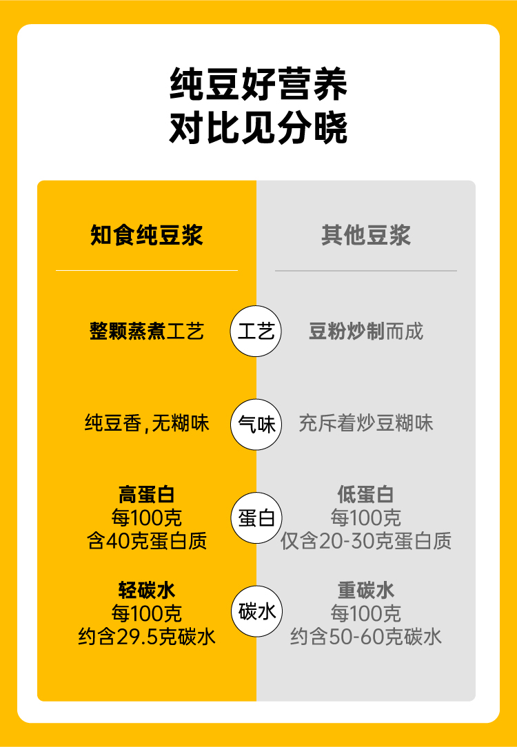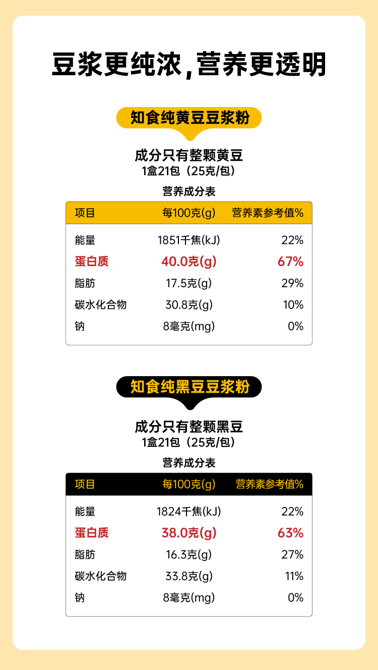 市面上一般的纯豆浆粉为了省事,大多是采用黄豆打粉后炒制的工艺,价格虽低,但会额外摄入油脂,而且容易出现带糊味的问题,这款知食大爆炸纯豆浆采用传统的原豆不去皮,整颗蒸熟工艺,不添加蔗糖增甜提香,不添加麦芽糖浆提高溶解度,不含反式脂肪和胆固醇,杯杯都是好豆浆。