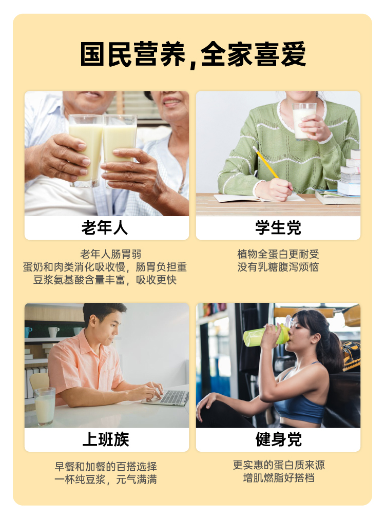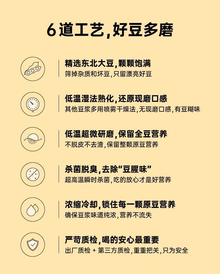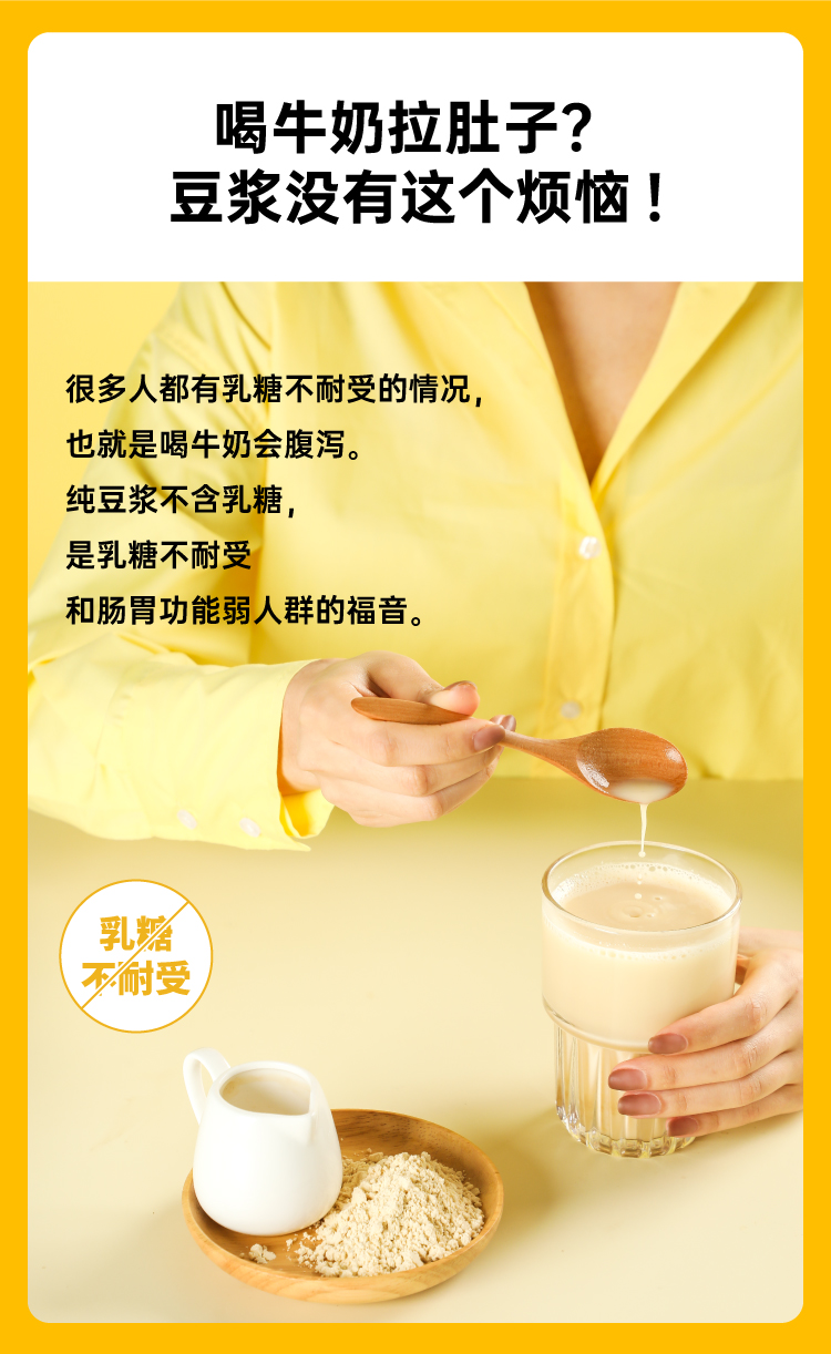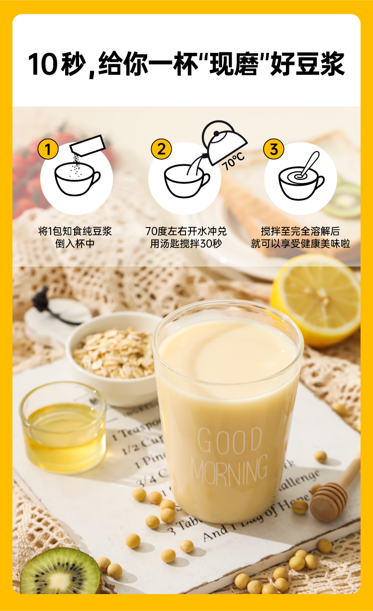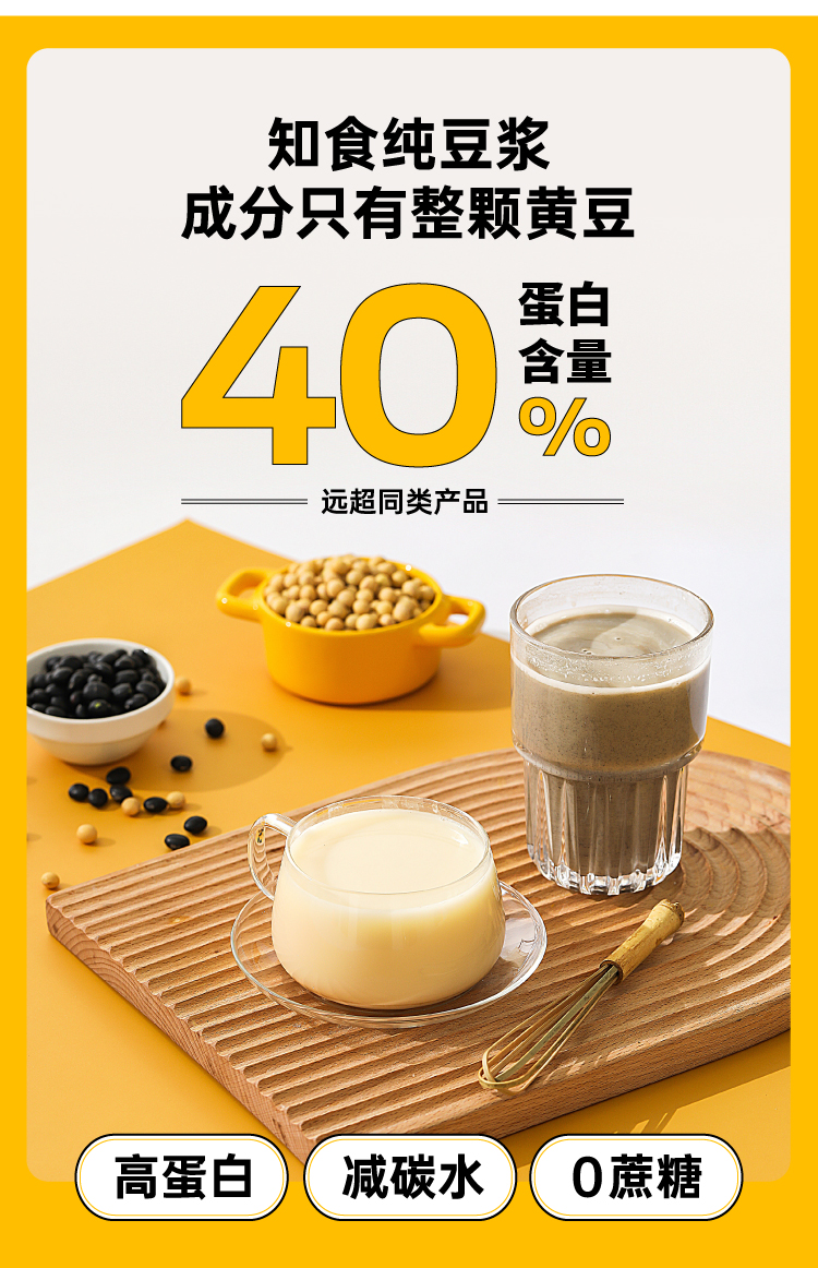 市面上一般的纯豆浆粉为了省事,大多是采用黄豆打粉后炒制的工艺,价格虽低,但会额外摄入油脂,而且容易出现带糊味的问题,这款知食大爆炸纯豆浆采用传统的原豆不去皮,整颗蒸熟工艺,不添加蔗糖增甜提香,不添加麦芽糖浆提高溶解度,不含反式脂肪和胆固醇,杯杯都是好豆浆。