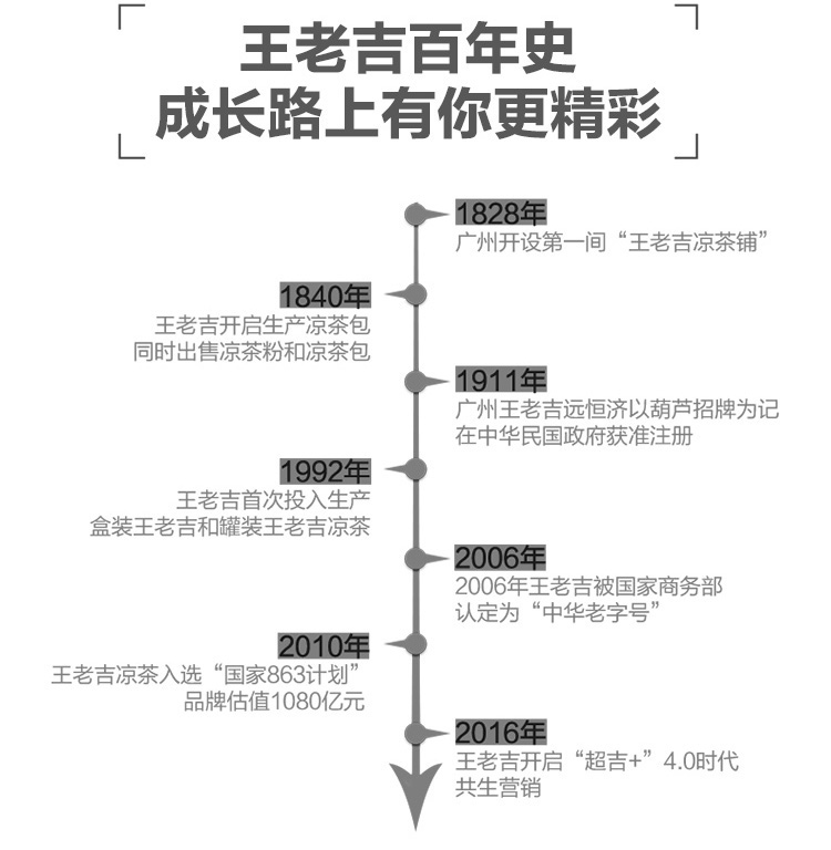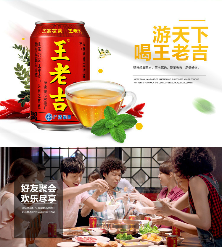 王老吉凉茶创立于清道光年间(1828年),至今已经有将近两百年的历史,被公认为凉王茶始祖。凉茶起源于广东,凉茶文化已逐渐从岭南一隅推广到全国。王老吉凉茶采用本草植物材料配制而成,主要配料为:仙草、鸡蛋花、布渣叶、菊花、金银花、夏枯草、甘草等。规格:310ml*24罐。